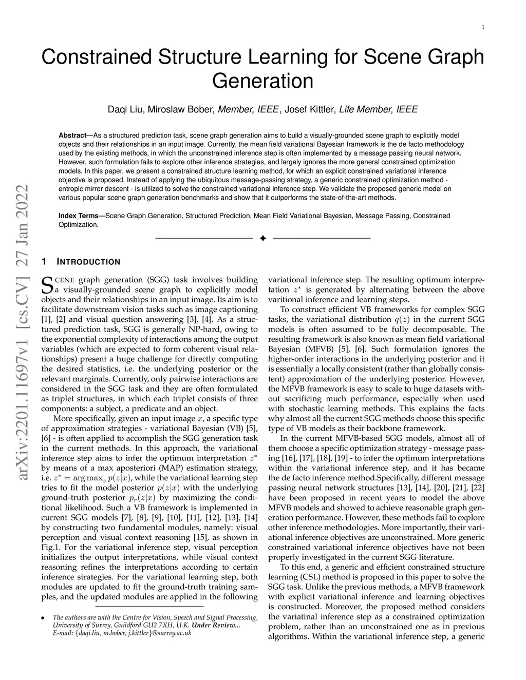 As a structured prediction task, scene graph generation aims to build a visually-grounded scene graph to explicitly model objects and their relationships in an input image. Currently, the mean field variational Bayesian framework is the de facto methodology used by the existing methods, in which the unconstrained inference step is often implemented by a message passing neural network. However, such formulation fails to explore other inference strategies, and largely ignores the more general constrained optimization models. In this paper, we present a constrained structure learning method, for which an explicit constrained variational inference objective is proposed. Instead of applying the ubiquitous message-passing strategy, a generic constrained optimization method - entropic mirror descent - is utilized to solve the constrained variational inference step. We validate the proposed generic model on various popular scene graph generation benchmarks and show that it outperforms the state-of-the-art methods.