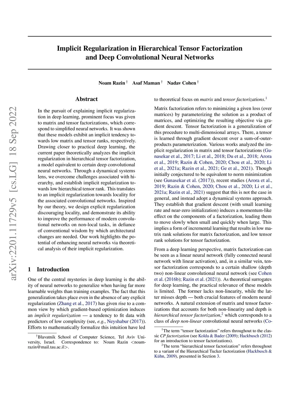 In the pursuit of explaining implicit regularization in deep learning, prominent focus was given to matrix and tensor factorizations, which correspond to simplified neural networks. It was shown that these models exhibit an implicit tendency towards low matrix and tensor ranks, respectively. Drawing closer to practical deep learning, the current paper theoretically analyzes the implicit regularization in hierarchical tensor factorization, a model equivalent to certain deep convolutional neural networks. Through a dynamical systems lens, we overcome challenges associated with hierarchy, and establish implicit regularization towards low hierarchical tensor rank. This translates to an implicit regularization towards locality for the associated convolutional networks. Inspired by our theory, we design explicit regularization discouraging locality, and demonstrate its ability to improve the performance of modern convolutional networks on non-local tasks, in defiance of conventional wisdom by which architectural changes are needed. Our work highlights the potential of enhancing neural networks via theoretical analysis of their implicit regularization.