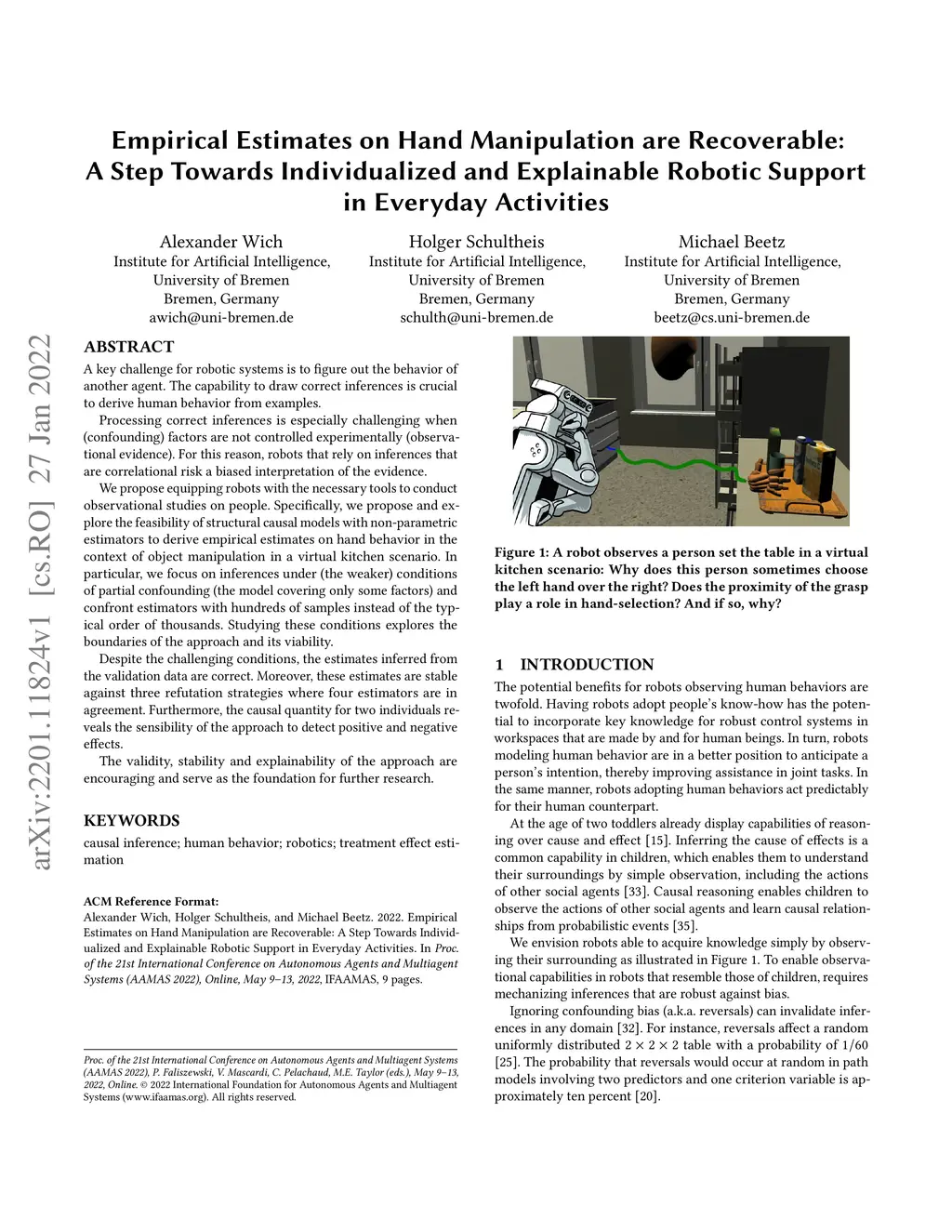 A key challenge for robotic systems is to figure out the behavior of another agent. The capability to draw correct inferences is crucial to derive human behavior from examples. Processing correct inferences is especially challenging when (confounding) factors are not controlled experimentally (observational evidence). For this reason, robots that rely on inferences that are correlational risk a biased interpretation of the evidence. We propose equipping robots with the necessary tools to conduct observational studies on people. Specifically, we propose and explore the feasibility of structural causal models with non-parametric estimators to derive empirical estimates on hand behavior in the context of object manipulation in a virtual kitchen scenario. In particular, we focus on inferences under (the weaker) conditions of partial confounding (the model covering only some factors) and confront estimators with hundreds of samples instead of the typical order of thousands. Studying these conditions explores the boundaries of the approach and its viability. Despite the challenging conditions, the estimates inferred from the validation data are correct. Moreover, these estimates are stable against three refutation strategies where four estimators are in agreement. Furthermore, the causal quantity for two individuals reveals the sensibility of the approach to detect positive and negative effects. The validity, stability and explainability of the approach are encouraging and serve as the foundation for further research.