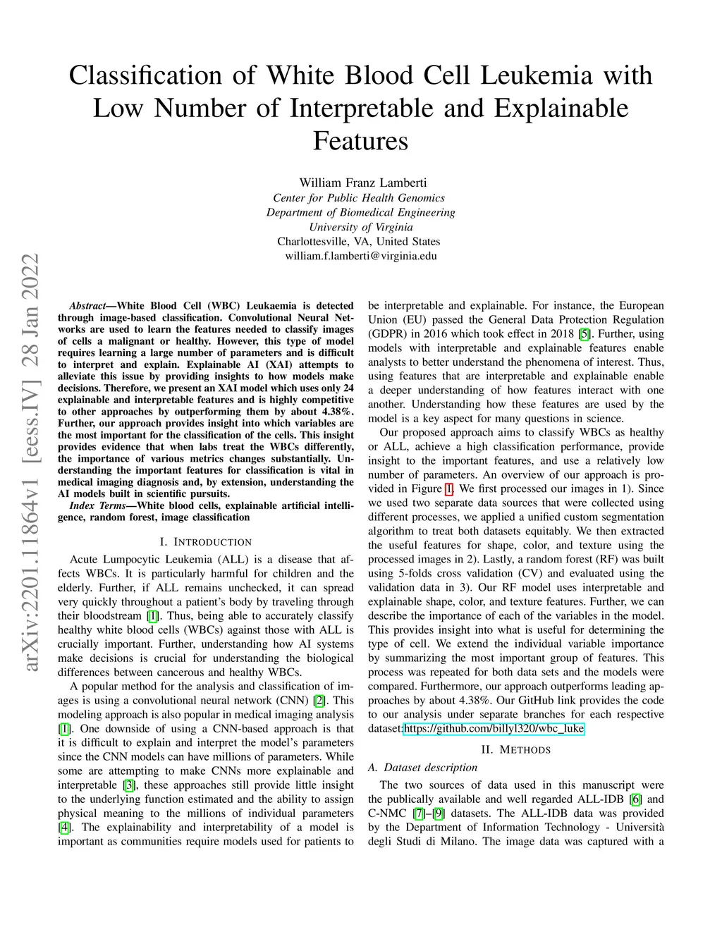 White Blood Cell (WBC) Leukaemia is detected through image-based classification. Convolutional Neural Networks are used to learn the features needed to classify images of cells a malignant or healthy. However, this type of model requires learning a large number of parameters and is difficult to interpret and explain. Explainable AI (XAI) attempts to alleviate this issue by providing insights to how models make decisions. Therefore, we present an XAI model which uses only 24 explainable and interpretable features and is highly competitive to other approaches by outperforming them by about 4.38\%. Further, our approach provides insight into which variables are the most important for the classification of the cells. This insight provides evidence that when labs treat the WBCs differently, the importance of various metrics changes substantially. Understanding the important features for classification is vital in medical imaging diagnosis and, by extension, understanding the AI models built in scientific pursuits.