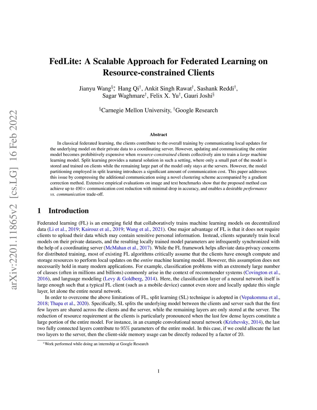 In classical federated learning, the clients contribute to the overall training by communicating local updates for the underlying model on their private data to a coordinating server. However, updating and communicating the entire model becomes prohibitively expensive when resource-constrained clients collectively aim to train a large machine learning model. Split learning provides a natural solution in such a setting, where only a small part of the model is stored and trained on clients while the remaining large part of the model only stays at the servers. However, the model partitioning employed in split learning introduces a significant amount of communication cost. This paper addresses this issue by compressing the additional communication using a novel clustering scheme accompanied by a gradient correction method. Extensive empirical evaluations on image and text benchmarks show that the proposed method can achieve up to communication cost reduction with minimal drop in accuracy, and enables a desirable performance vs. communication trade-off.