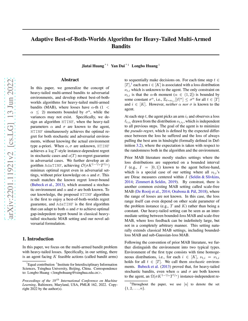 In this paper, we generalize the concept of heavy-tailed multi-armed bandits to adversarial environments, and develop robust best-of-both-worlds algorithms for heavy-tailed multi-armed bandits (MAB), where losses have -th () moments bounded by , while the variances may not exist. Specifically, we design an algorithm \texttt{HTINF}, when the heavy-tail parameters and are known to the agent, \texttt{HTINF} simultaneously achieves the optimal regret for both stochastic and adversarial environments, without knowing the actual environment type a-priori. When are unknown, \texttt{HTINF} achieves a -style instance-dependent regret in stochastic cases and no-regret guarantee in adversarial cases. We further develop an algorithm \texttt{AdaTINF}, achieving minimax optimal regret even in adversarial settings, without prior knowledge on and . This result matches the known regret lower-bound (Bubeck et al., 2013), which assumed a stochastic environment and and are both known. To our knowledge, the proposed \texttt{HTINF} algorithm is the first to enjoy a best-of-both-worlds regret guarantee, and \texttt{AdaTINF} is the first algorithm that can adapt to both and to achieve optimal gap-indepedent regret bound in classical heavy-tailed stochastic MAB setting and our novel adversarial formulation.