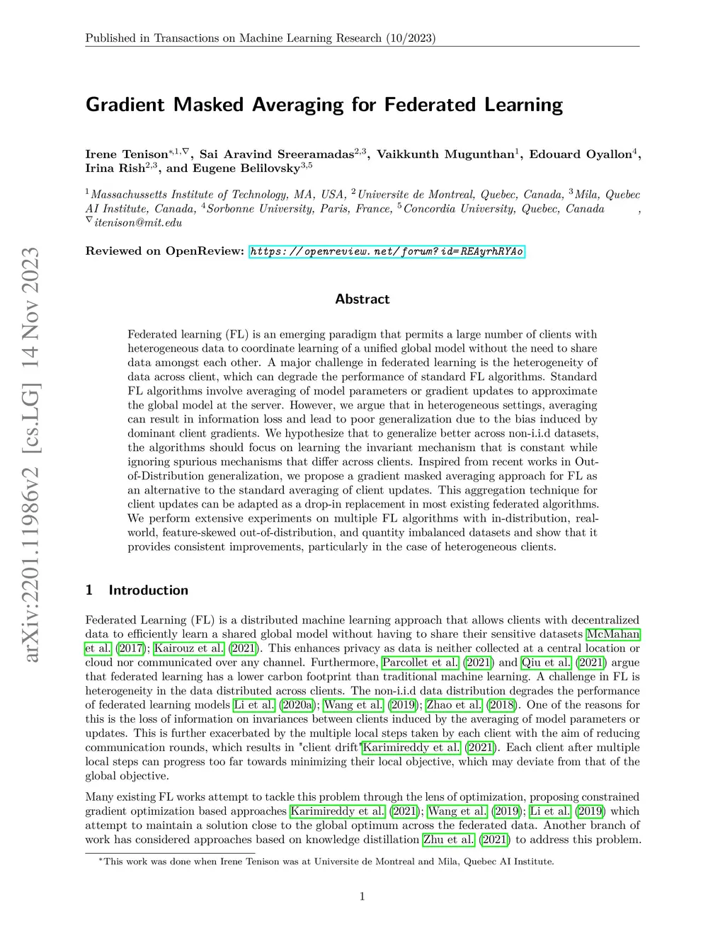 Federated learning (FL) is an emerging paradigm that permits a large number of clients with heterogeneous data to coordinate learning of a unified global model without the need to share data amongst each other. A major challenge in federated learning is the heterogeneity of data across client, which can degrade the performance of standard FL algorithms. Standard FL algorithms involve averaging of model parameters or gradient updates to approximate the global model at the server. However, we argue that in heterogeneous settings, averaging can result in information loss and lead to poor generalization due to the bias induced by dominant client gradients. We hypothesize that to generalize better across non-i.i.d datasets, the algorithms should focus on learning the invariant mechanism that is constant while ignoring spurious mechanisms that differ across clients. Inspired from recent works in Out-of-Distribution generalization, we propose a gradient masked averaging approach for FL as an alternative to the standard averaging of client updates. This aggregation technique for client updates can be adapted as a drop-in replacement in most existing federated algorithms. We perform extensive experiments on multiple FL algorithms with in-distribution, real-world, feature-skewed out-of-distribution, and quantity imbalanced datasets and show that it provides consistent improvements, particularly in the case of heterogeneous clients.