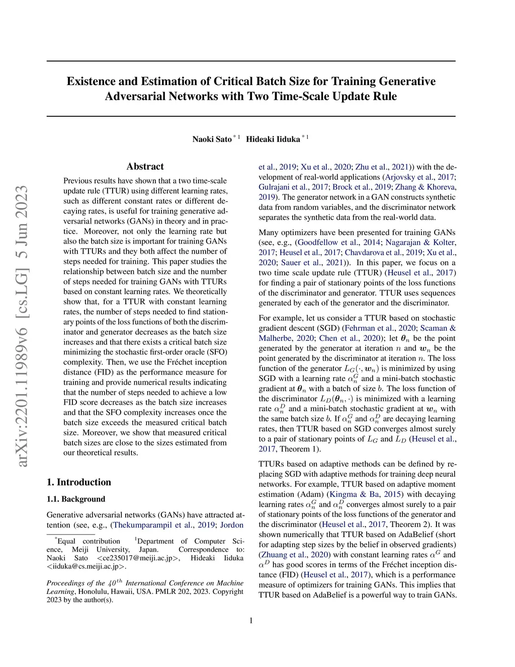 Previous results have shown that a two time-scale update rule (TTUR) using different learning rates, such as different constant rates or different decaying rates, is useful for training generative adversarial networks (GANs) in theory and in practice. Moreover, not only the learning rate but also the batch size is important for training GANs with TTURs and they both affect the number of steps needed for training. This paper studies the relationship between batch size and the number of steps needed for training GANs with TTURs based on constant learning rates. We theoretically show that, for a TTUR with constant learning rates, the number of steps needed to find stationary points of the loss functions of both the discriminator and generator decreases as the batch size increases and that there exists a critical batch size minimizing the stochastic first-order oracle (SFO) complexity. Then, we use the Fréchet inception distance (FID) as the performance measure for training and provide numerical results indicating that the number of steps needed to achieve a low FID score decreases as the batch size increases and that the SFO complexity increases once the batch size exceeds the measured critical batch size. Moreover, we show that measured critical batch sizes are close to the sizes estimated from our theoretical results.