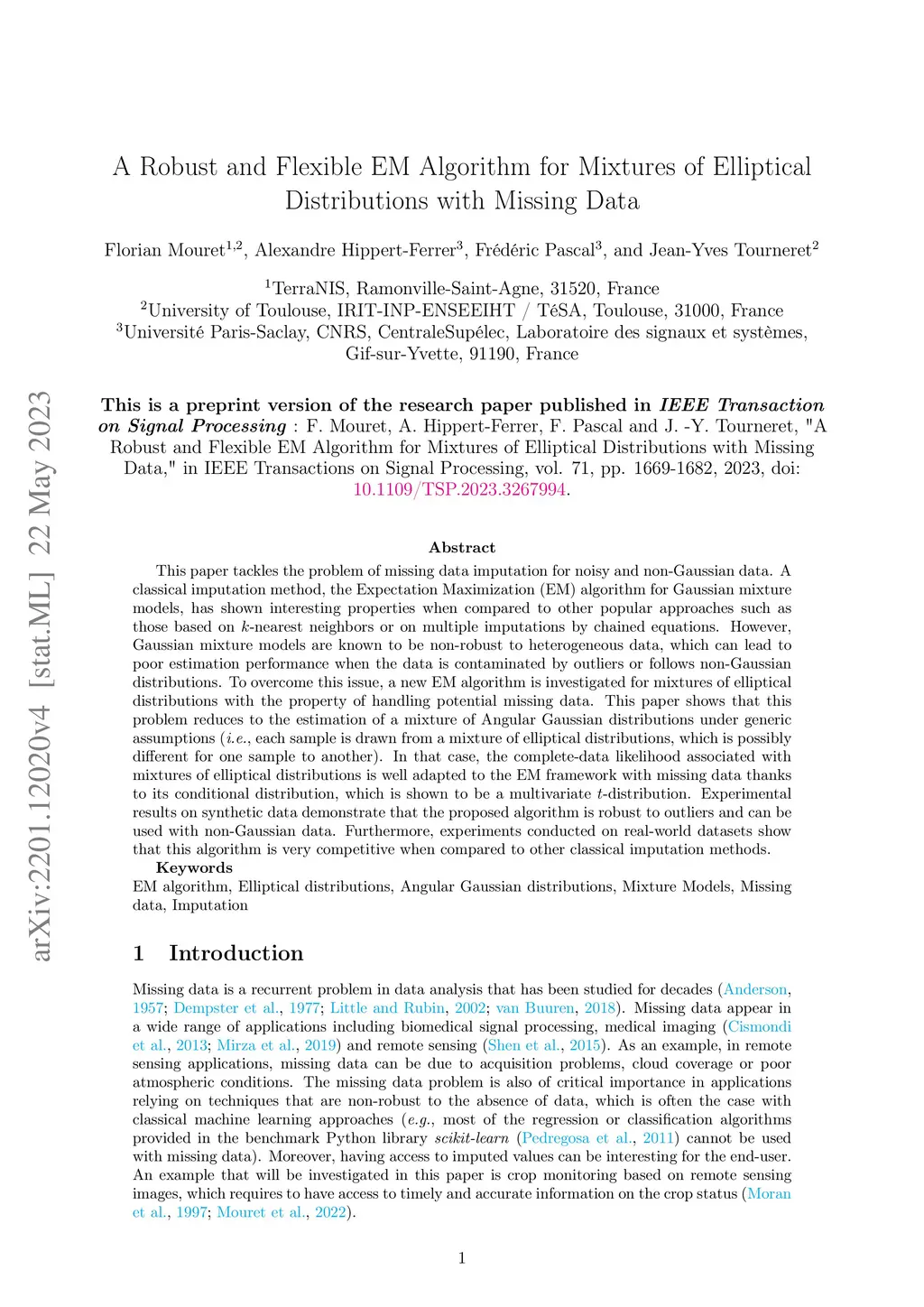 This paper tackles the problem of missing data imputation for noisy and non-Gaussian data. A classical imputation method, the Expectation Maximization (EM) algorithm for Gaussian mixture models, has shown interesting properties when compared to other popular approaches such as those based on k-nearest neighbors or on multiple imputations by chained equations. However, Gaussian mixture models are known to be non-robust to heterogeneous data, which can lead to poor estimation performance when the data is contaminated by outliers or follows non-Gaussian distributions. To overcome this issue, a new EM algorithm is investigated for mixtures of elliptical distributions with the property of handling potential missing data. This paper shows that this problem reduces to the estimation of a mixture of Angular Gaussian distributions under generic assumptions (i.e., each sample is drawn from a mixture of elliptical distributions, which is possibly different for one sample to another). In that case, the complete-data likelihood associated with mixtures of elliptical distributions is well adapted to the EM framework with missing data thanks to its conditional distribution, which is shown to be a multivariate -distribution. Experimental results on synthetic data demonstrate that the proposed algorithm is robust to outliers and can be used with non-Gaussian data. Furthermore, experiments conducted on real-world datasets show that this algorithm is very competitive when compared to other classical imputation methods.