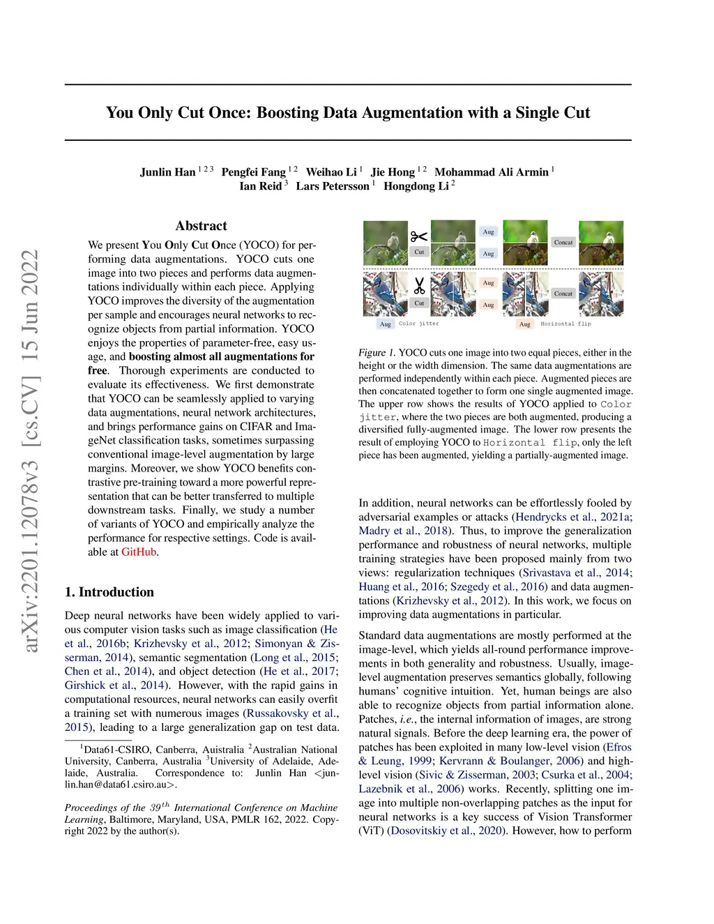 We present You Only Cut Once (YOCO) for performing data augmentations. YOCO cuts one image into two pieces and performs data augmentations individually within each piece. Applying YOCO improves the diversity of the augmentation per sample and encourages neural networks to recognize objects from partial information. YOCO enjoys the properties of parameter-free, easy usage, and boosting almost all augmentations for free. Thorough experiments are conducted to evaluate its effectiveness. We first demonstrate that YOCO can be seamlessly applied to varying data augmentations, neural network architectures, and brings performance gains on CIFAR and ImageNet classification tasks, sometimes surpassing conventional image-level augmentation by large margins. Moreover, we show YOCO benefits contrastive pre-training toward a more powerful representation that can be better transferred to multiple downstream tasks. Finally, we study a number of variants of YOCO and empirically analyze the performance for respective settings. Code is available at GitHub.