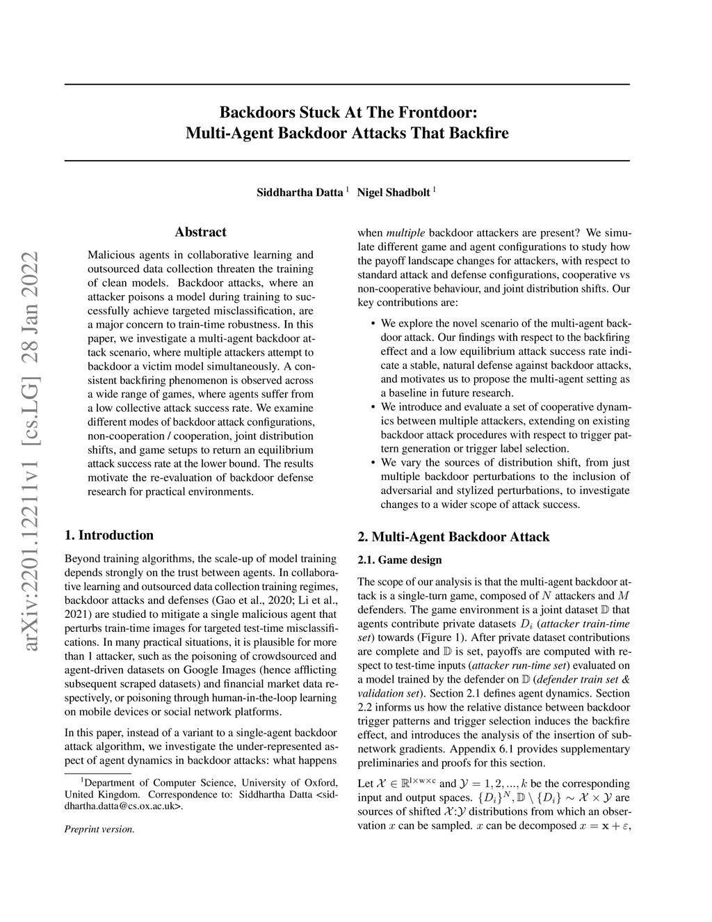 Malicious agents in collaborative learning and outsourced data collection threaten the training of clean models. Backdoor attacks, where an attacker poisons a model during training to successfully achieve targeted misclassification, are a major concern to train-time robustness. In this paper, we investigate a multi-agent backdoor attack scenario, where multiple attackers attempt to backdoor a victim model simultaneously. A consistent backfiring phenomenon is observed across a wide range of games, where agents suffer from a low collective attack success rate. We examine different modes of backdoor attack configurations, non-cooperation / cooperation, joint distribution shifts, and game setups to return an equilibrium attack success rate at the lower bound. The results motivate the re-evaluation of backdoor defense research for practical environments.