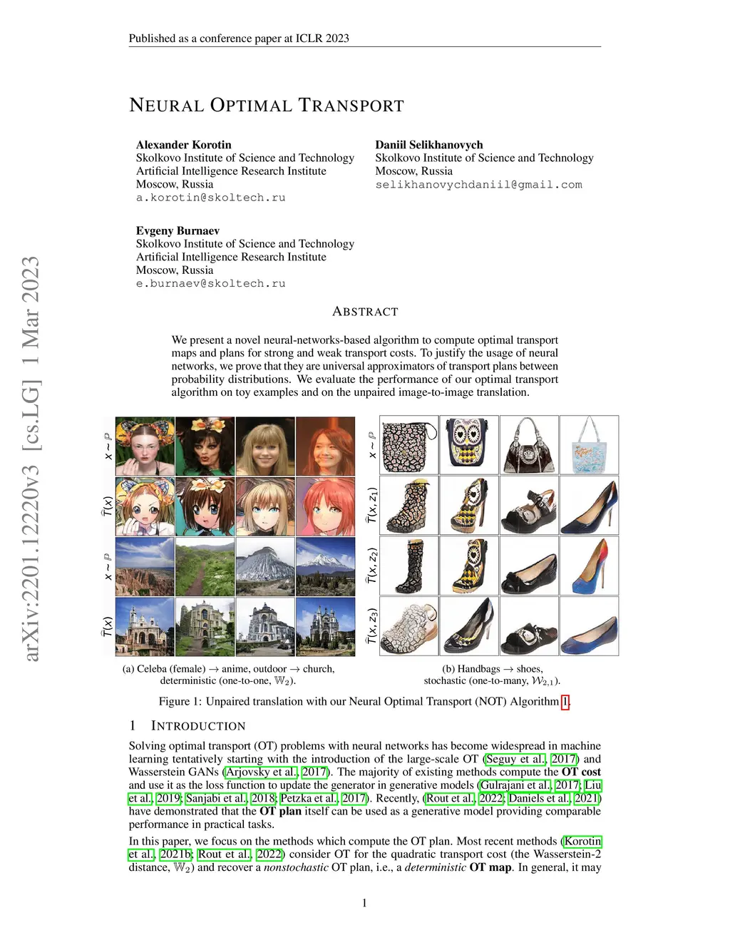 We present a novel neural-networks-based algorithm to compute optimal transport maps and plans for strong and weak transport costs. To justify the usage of neural networks, we prove that they are universal approximators of transport plans between probability distributions. We evaluate the performance of our optimal transport algorithm on toy examples and on the unpaired image-to-image translation.