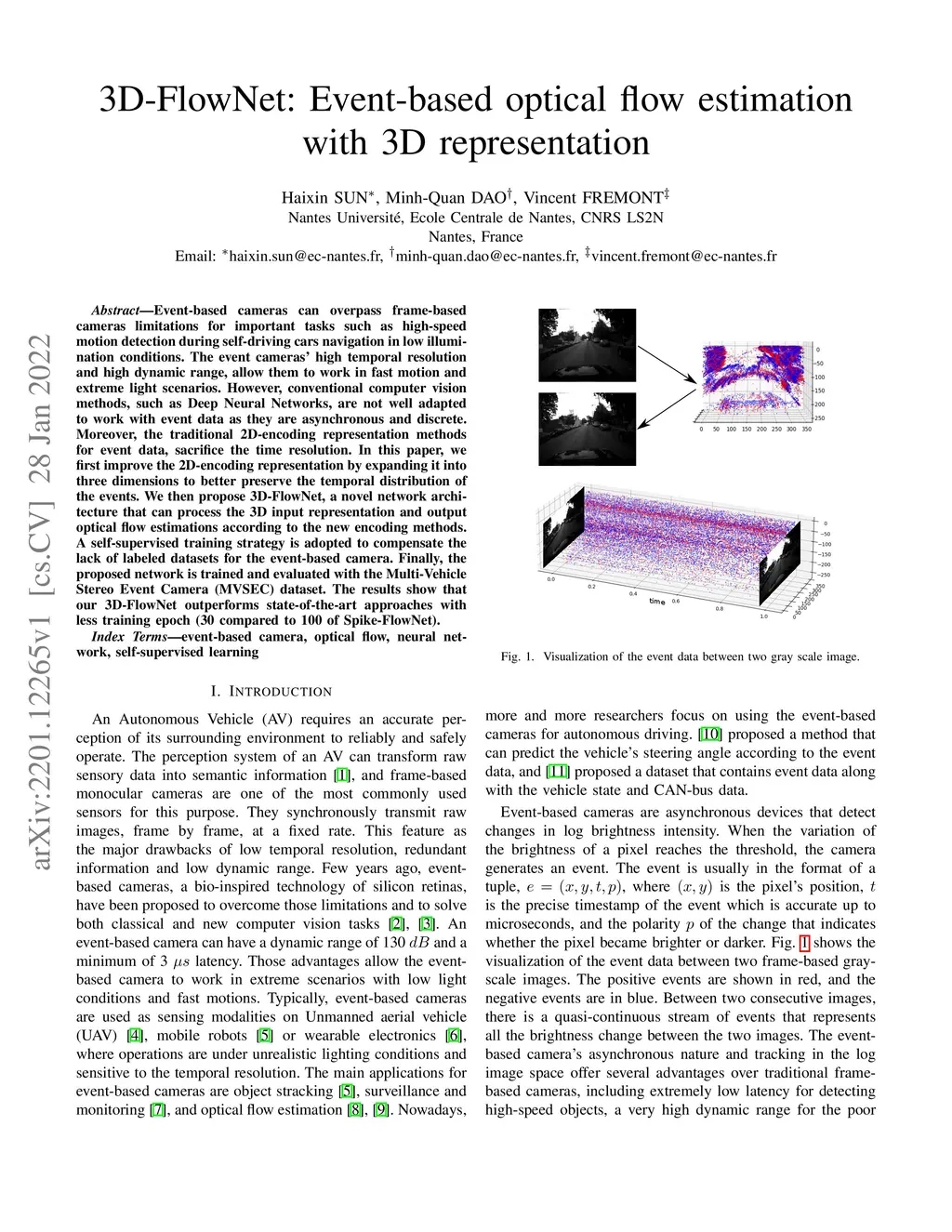 Event-based cameras can overpass frame-based cameras limitations for important tasks such as high-speed motion detection during self-driving cars navigation in low illumination conditions. The event cameras' high temporal resolution and high dynamic range, allow them to work in fast motion and extreme light scenarios. However, conventional computer vision methods, such as Deep Neural Networks, are not well adapted to work with event data as they are asynchronous and discrete. Moreover, the traditional 2D-encoding representation methods for event data, sacrifice the time resolution. In this paper, we first improve the 2D-encoding representation by expanding it into three dimensions to better preserve the temporal distribution of the events. We then propose 3D-FlowNet, a novel network architecture that can process the 3D input representation and output optical flow estimations according to the new encoding methods. A self-supervised training strategy is adopted to compensate the lack of labeled datasets for the event-based camera. Finally, the proposed network is trained and evaluated with the Multi-Vehicle Stereo Event Camera (MVSEC) dataset. The results show that our 3D-FlowNet outperforms state-of-the-art approaches with less training epoch (30 compared to 100 of Spike-FlowNet).