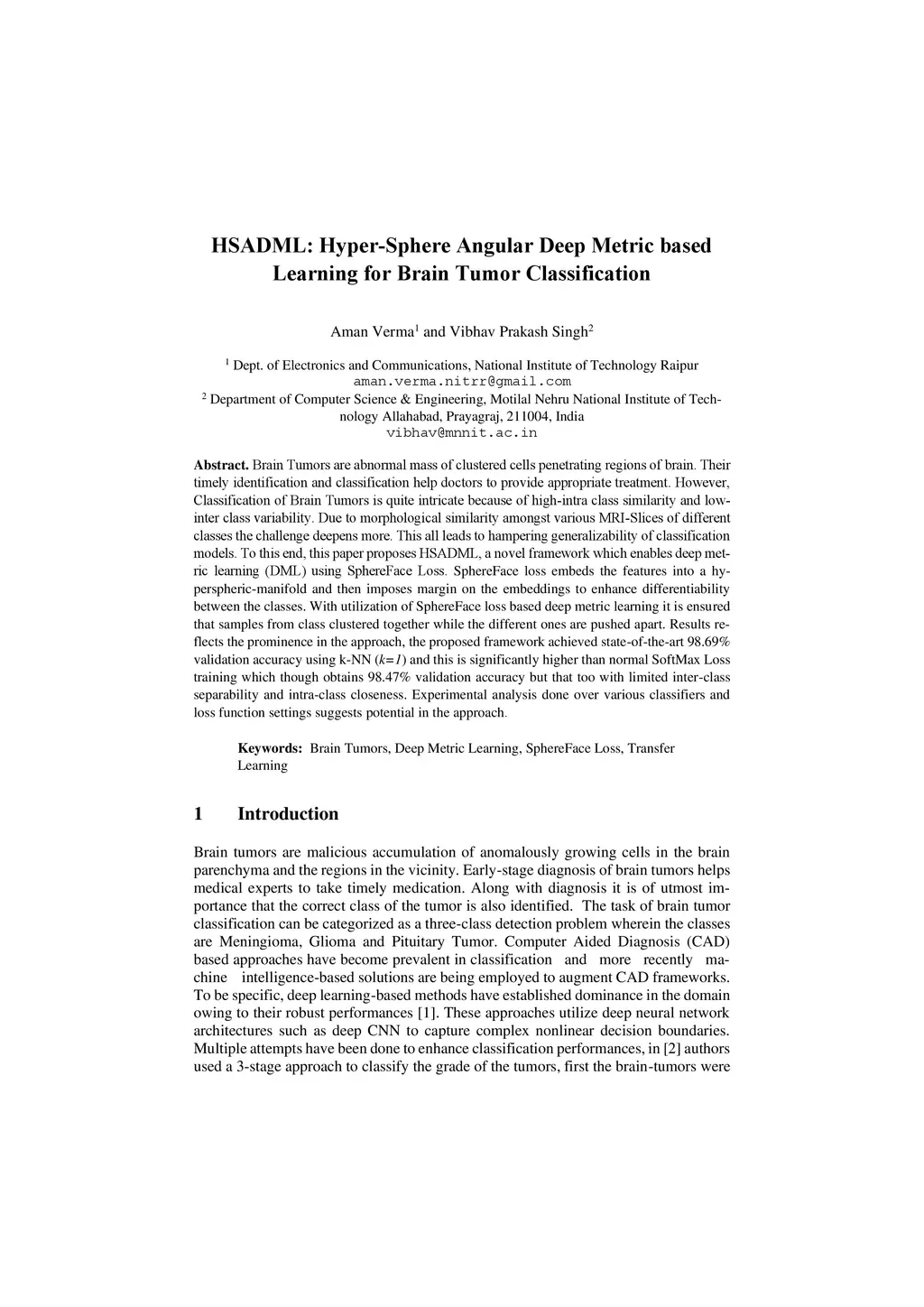 HSADML: Hyper-Sphere Angular Deep Metric based Learning for Brain Tumor