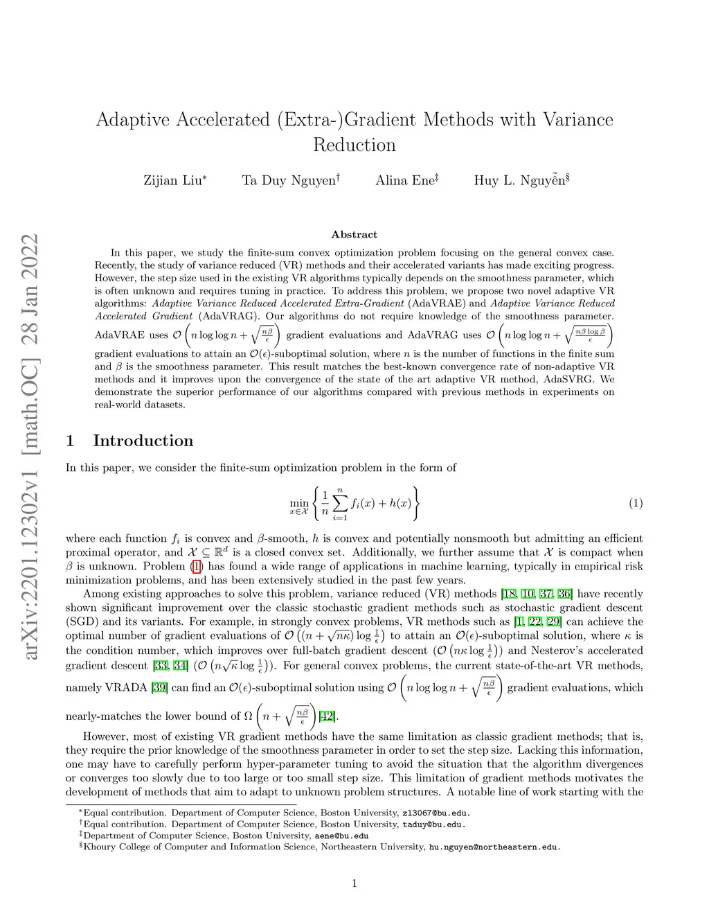 In this paper, we study the finite-sum convex optimization problem focusing on the general convex case. Recently, the study of variance reduced (VR) methods and their accelerated variants has made exciting progress. However, the step size used in the existing VR algorithms typically depends on the smoothness parameter, which is often unknown and requires tuning in practice. To address this problem, we propose two novel adaptive VR algorithms: Adaptive Variance Reduced Accelerated Extra-Gradient (AdaVRAE) and Adaptive Variance Reduced Accelerated Gradient (AdaVRAG). Our algorithms do not require knowledge of the smoothness parameter. AdaVRAE uses gradient evaluations and AdaVRAG uses gradient evaluations to attain an -suboptimal solution, where is the number of functions in the finite sum and is the smoothness parameter. This result matches the best-known convergence rate of non-adaptive VR methods and it improves upon the convergence of the state of the art adaptive VR method, AdaSVRG. We demonstrate the superior performance of our algorithms compared with previous methods in experiments on real-world datasets.