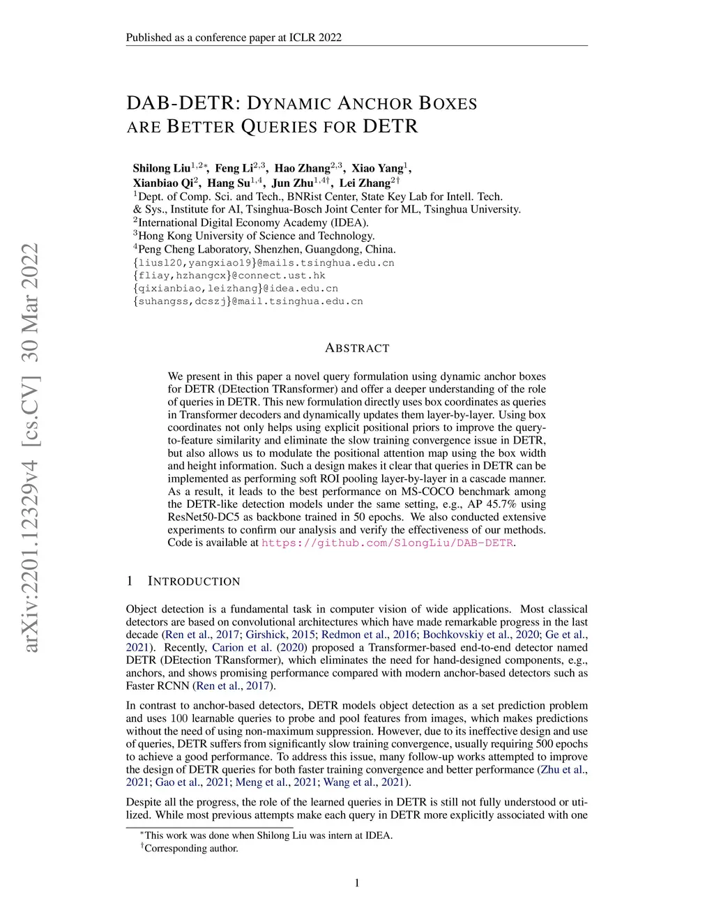 DAB-DETR: Dynamic Anchor Boxes are Better Queries for DETR