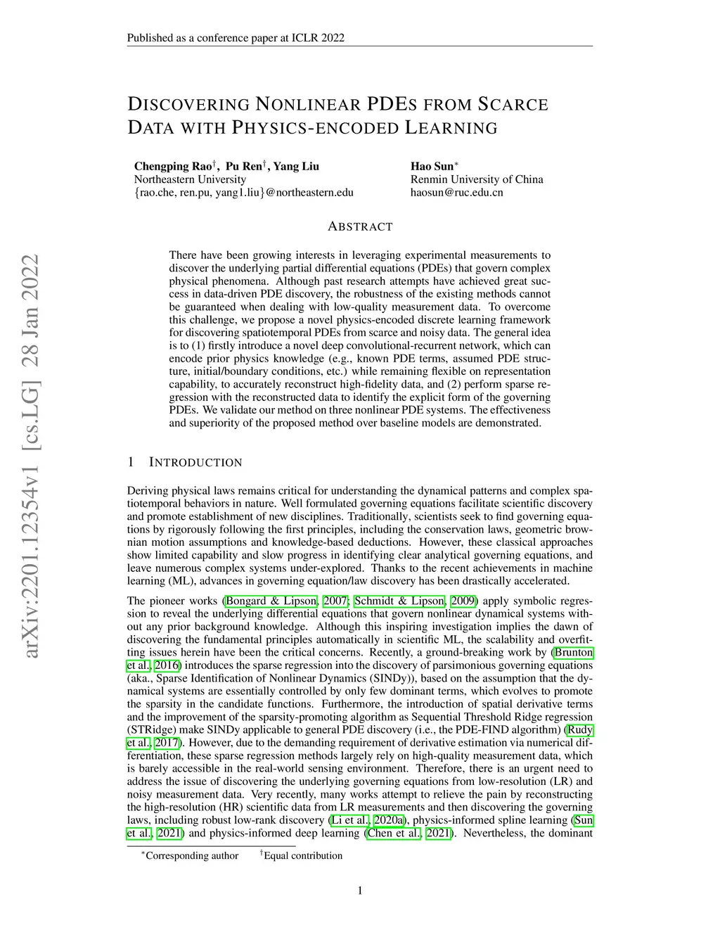 Discovering Nonlinear PDEs from Scarce Data with Physics-encoded