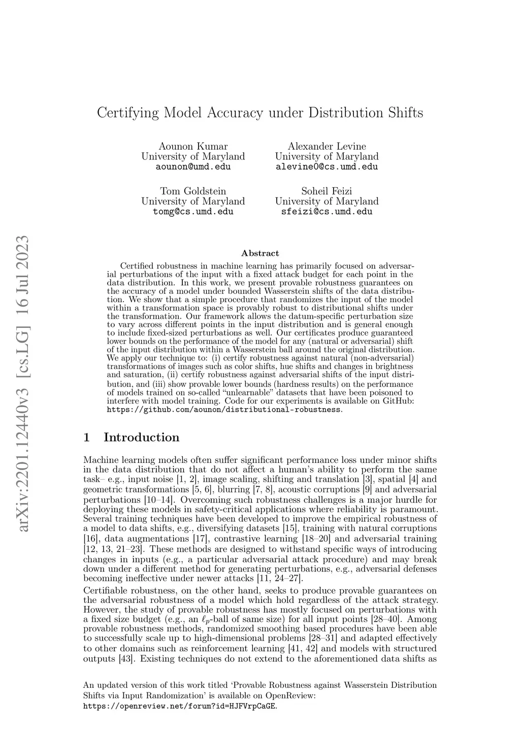 Certified robustness in machine learning has primarily focused on adversarial perturbations of the input with a fixed attack budget for each point in the data distribution. In this work, we present provable robustness guarantees on the accuracy of a model under bounded Wasserstein shifts of the data distribution. We show that a simple procedure that randomizes the input of the model within a transformation space is provably robust to distributional shifts under the transformation. Our framework allows the datum-specific perturbation size to vary across different points in the input distribution and is general enough to include fixed-sized perturbations as well. Our certificates produce guaranteed lower bounds on the performance of the model for any (natural or adversarial) shift of the input distribution within a Wasserstein ball around the original distribution. We apply our technique to: (i) certify robustness against natural (non-adversarial) transformations of images such as color shifts, hue shifts and changes in brightness and saturation, (ii) certify robustness against adversarial shifts of the input distribution, and (iii) show provable lower bounds (hardness results) on the performance of models trained on so-called "unlearnable" datasets that have been poisoned to interfere with model training.