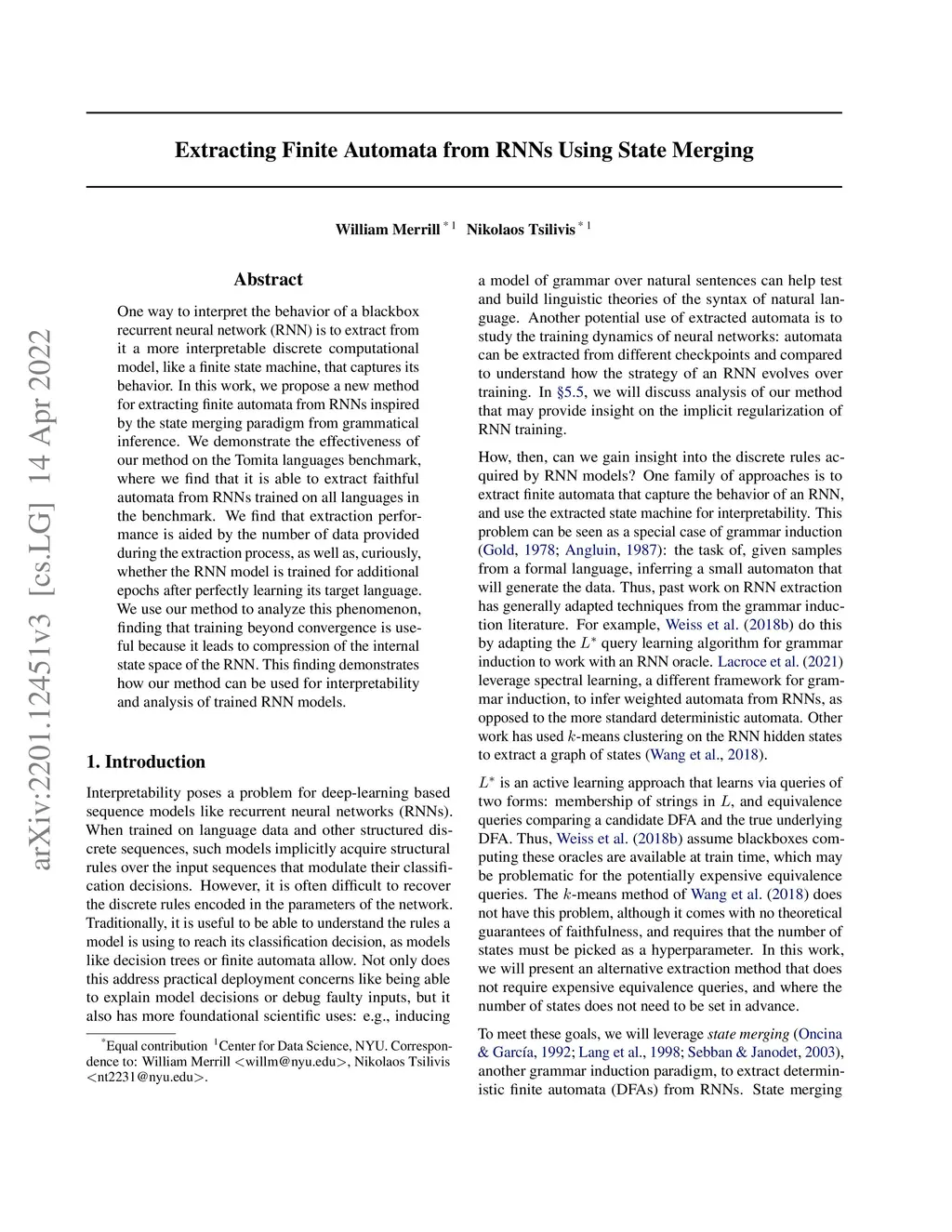 One way to interpret the behavior of a blackbox recurrent neural network (RNN) is to extract from it a more interpretable discrete computational model, like a finite state machine, that captures its behavior. In this work, we propose a new method for extracting finite automata from RNNs inspired by the state merging paradigm from grammatical inference. We demonstrate the effectiveness of our method on the Tomita languages benchmark, where we find that it is able to extract faithful automata from RNNs trained on all languages in the benchmark. We find that extraction performance is aided by the number of data provided during the extraction process, as well as, curiously, whether the RNN model is trained for additional epochs after perfectly learning its target language. We use our method to analyze this phenomenon, finding that training beyond convergence is useful because it leads to compression of the internal state space of the RNN. This finding demonstrates how our method can be used for interpretability and analysis of trained RNN models.
