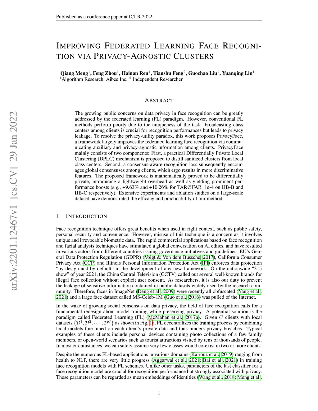 The growing public concerns on data privacy in face recognition can be greatly addressed by the federated learning (FL) paradigm. However, conventional FL methods perform poorly due to the uniqueness of the task: broadcasting class centers among clients is crucial for recognition performances but leads to privacy leakage. To resolve the privacy-utility paradox, this work proposes PrivacyFace, a framework largely improves the federated learning face recognition via communicating auxiliary and privacy-agnostic information among clients. PrivacyFace mainly consists of two components: First, a practical Differentially Private Local Clustering (DPLC) mechanism is proposed to distill sanitized clusters from local class centers. Second, a consensus-aware recognition loss subsequently encourages global consensuses among clients, which ergo results in more discriminative features. The proposed framework is mathematically proved to be differentially private, introducing a lightweight overhead as well as yielding prominent performance boosts (\textit{e.g.}, +9.63\% and +10.26\% for TAR@FAR=1e-4 on IJB-B and IJB-C respectively). Extensive experiments and ablation studies on a large-scale dataset have demonstrated the efficacy and practicability of our method.