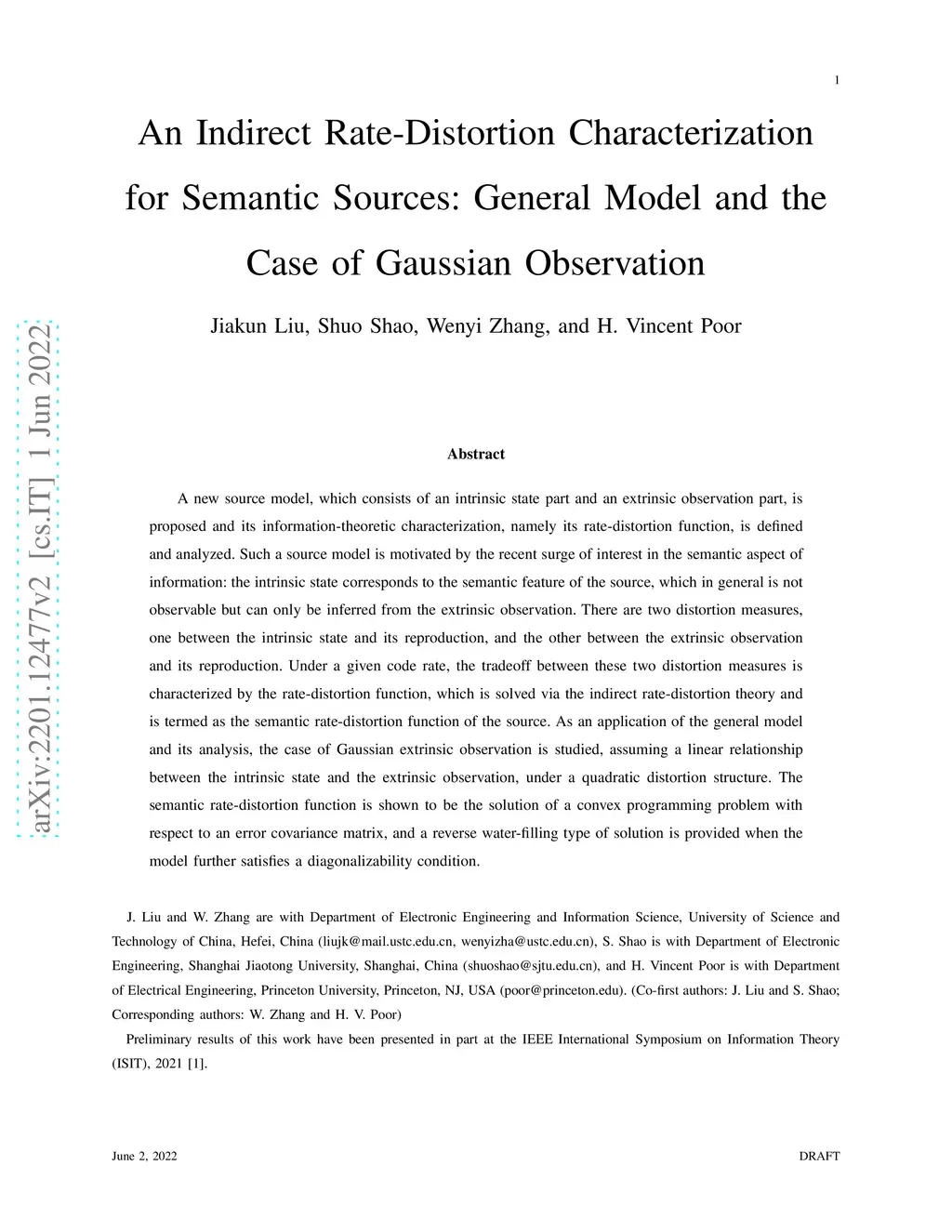 A new source model, which consists of an intrinsic state part and an extrinsic observation part, is proposed and its information-theoretic characterization, namely its rate-distortion function, is defined and analyzed. Such a source model is motivated by the recent surge of interest in the semantic aspect of information: the intrinsic state corresponds to the semantic feature of the source, which in general is not observable but can only be inferred from the extrinsic observation. There are two distortion measures, one between the intrinsic state and its reproduction, and the other between the extrinsic observation and its reproduction. Under a given code rate, the tradeoff between these two distortion measures is characterized by the rate-distortion function, which is solved via the indirect rate-distortion theory and is termed as the semantic rate-distortion function of the source. As an application of the general model and its analysis, the case of Gaussian extrinsic observation is studied, assuming a linear relationship between the intrinsic state and the extrinsic observation, under a quadratic distortion structure. The semantic rate-distortion function is shown to be the solution of a convex programming programming problem with respect to an error covariance matrix, and a reverse water-filling type of solution is provided when the model further satisfies a diagonalizability condition.