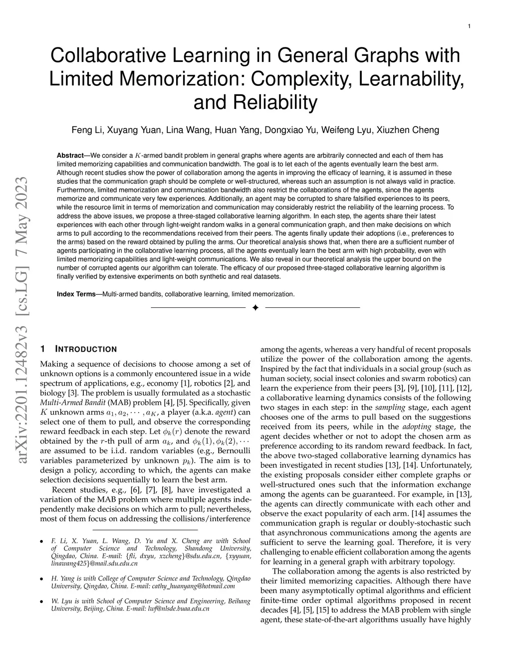 We consider a K-armed bandit problem in general graphs where agents are arbitrarily connected and each of them has limited memorizing capabilities and communication bandwidth. The goal is to let each of the agents eventually learn the best arm. It is assumed in these studies that the communication graph should be complete or well-structured, whereas such an assumption is not always valid in practice. Furthermore, limited memorization and communication bandwidth also restrict the collaborations of the agents, since the agents memorize and communicate very few experiences. Additionally, an agent may be corrupted to share falsified experiences to its peers, while the resource limit in terms of memorization and communication may considerably restrict the reliability of the learning process. To address the above issues, we propose a three-staged collaborative learning algorithm. In each step, the agents share their latest experiences with each other through light-weight random walks in a general communication graph, and then make decisions on which arms to pull according to the recommendations received from their peers. The agents finally update their adoptions (i.e., preferences to the arms) based on the reward obtained by pulling the arms. Our theoretical analysis shows that, when there are a sufficient number of agents participating in the collaborative learning process, all the agents eventually learn the best arm with high probability, even with limited memorizing capabilities and light-weight communications. We also reveal in our theoretical analysis the upper bound on the number of corrupted agents our algorithm can tolerate. The efficacy of our proposed three-staged collaborative learning algorithm is finally verified by extensive experiments on both synthetic and real datasets.