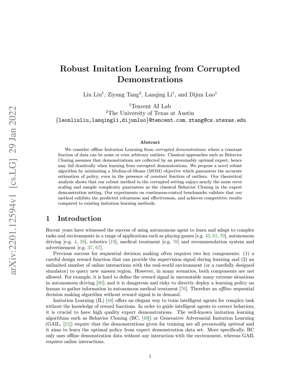 We consider offline Imitation Learning from corrupted demonstrations where a constant fraction of data can be noise or even arbitrary outliers. Classical approaches such as Behavior Cloning assumes that demonstrations are collected by an presumably optimal expert, hence may fail drastically when learning from corrupted demonstrations. We propose a novel robust algorithm by minimizing a Median-of-Means (MOM) objective which guarantees the accurate estimation of policy, even in the presence of constant fraction of outliers. Our theoretical analysis shows that our robust method in the corrupted setting enjoys nearly the same error scaling and sample complexity guarantees as the classical Behavior Cloning in the expert demonstration setting. Our experiments on continuous-control benchmarks validate that our method exhibits the predicted robustness and effectiveness, and achieves competitive results compared to existing imitation learning methods.