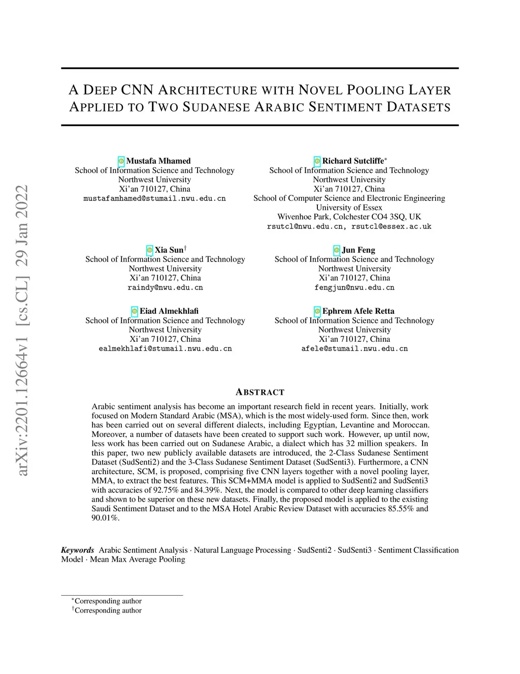 Arabic sentiment analysis has become an important research field in recent years. Initially, work focused on Modern Standard Arabic (MSA), which is the most widely-used form. Since then, work has been carried out on several different dialects, including Egyptian, Levantine and Moroccan. Moreover, a number of datasets have been created to support such work. However, up until now, less work has been carried out on Sudanese Arabic, a dialect which has 32 million speakers. In this paper, two new publicly available datasets are introduced, the 2-Class Sudanese Sentiment Dataset (SudSenti2) and the 3-Class Sudanese Sentiment Dataset (SudSenti3). Furthermore, a CNN architecture, SCM, is proposed, comprising five CNN layers together with a novel pooling layer, MMA, to extract the best features. This SCM+MMA model is applied to SudSenti2 and SudSenti3 with accuracies of 92.75% and 84.39%. Next, the model is compared to other deep learning classifiers and shown to be superior on these new datasets. Finally, the proposed model is applied to the existing Saudi Sentiment Dataset and to the MSA Hotel Arabic Review Dataset with accuracies 85.55% and 90.01%.
