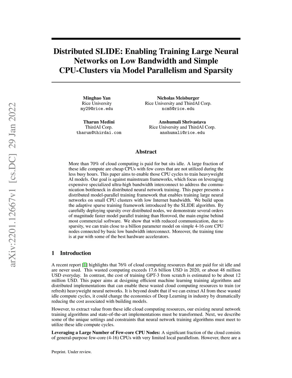 More than 70% of cloud computing is paid for but sits idle. A large fraction of these idle compute are cheap CPUs with few cores that are not utilized during the less busy hours. This paper aims to enable those CPU cycles to train heavyweight AI models. Our goal is against mainstream frameworks, which focus on leveraging expensive specialized ultra-high bandwidth interconnect to address the communication bottleneck in distributed neural network training. This paper presents a distributed model-parallel training framework that enables training large neural networks on small CPU clusters with low Internet bandwidth. We build upon the adaptive sparse training framework introduced by the SLIDE algorithm. By carefully deploying sparsity over distributed nodes, we demonstrate several orders of magnitude faster model parallel training than Horovod, the main engine behind most commercial software. We show that with reduced communication, due to sparsity, we can train close to a billion parameter model on simple 4-16 core CPU nodes connected by basic low bandwidth interconnect. Moreover, the training time is at par with some of the best hardware accelerators.