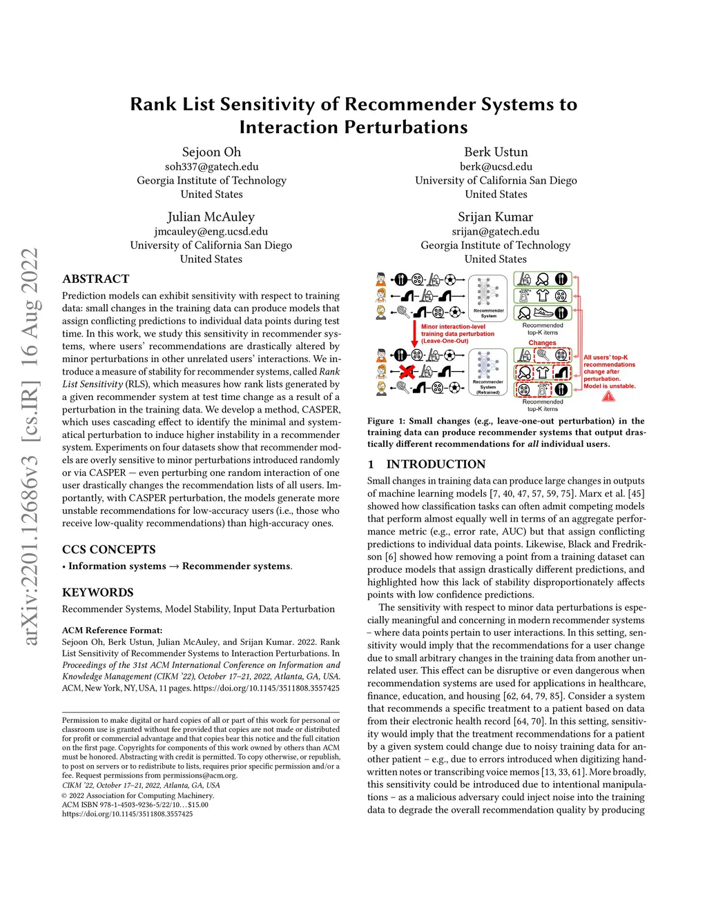 Prediction models can exhibit sensitivity with respect to training data: small changes in the training data can produce models that assign conflicting predictions to individual data points during test time. In this work, we study this sensitivity in recommender systems, where users' recommendations are drastically altered by minor perturbations in other unrelated users' interactions. We introduce a measure of stability for recommender systems, called Rank List Sensitivity (RLS), which measures how rank lists generated by a given recommender system at test time change as a result of a perturbation in the training data. We develop a method, CASPER, which uses cascading effect to identify the minimal and systematical perturbation to induce higher instability in a recommender system. Experiments on four datasets show that recommender models are overly sensitive to minor perturbations introduced randomly or via CASPER - even perturbing one random interaction of one user drastically changes the recommendation lists of all users. Importantly, with CASPER perturbation, the models generate more unstable recommendations for low-accuracy users (i.e., those who receive low-quality recommendations) than high-accuracy ones.