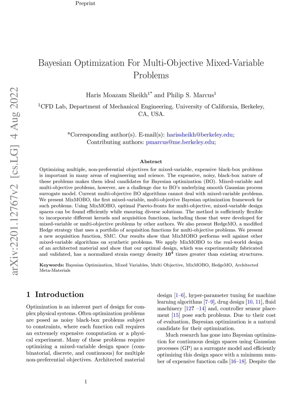 Optimizing multiple, non-preferential objectives for mixed-variable, expensive black-box problems is important in many areas of engineering and science. The expensive, noisy, black-box nature of these problems makes them ideal candidates for Bayesian optimization (BO). Mixed-variable and multi-objective problems, however, are a challenge due to BO's underlying smooth Gaussian process surrogate model. Current multi-objective BO algorithms cannot deal with mixed-variable problems. We present MixMOBO, the first mixed-variable, multi-objective Bayesian optimization framework for such problems. Using MixMOBO, optimal Pareto-fronts for multi-objective, mixed-variable design spaces can be found efficiently while ensuring diverse solutions. The method is sufficiently flexible to incorporate different kernels and acquisition functions, including those that were developed for mixed-variable or multi-objective problems by other authors. We also present HedgeMO, a modified Hedge strategy that uses a portfolio of acquisition functions for multi-objective problems. We present a new acquisition function, SMC. Our results show that MixMOBO performs well against other mixed-variable algorithms on synthetic problems. We apply MixMOBO to the real-world design of an architected material and show that our optimal design, which was experimentally fabricated and validated, has a normalized strain energy density times greater than existing structures.