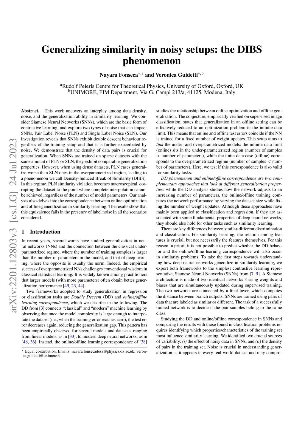 Contrastive learning aims to extract distinctive features from data by finding an embedding representation where similar samples are close to each other, and different ones are far apart. We study how NNs generalize the concept of similarity in the presence of noise, investigating two phenomena: Double Descent (DD) behavior and online/offline correspondence. While DD examines how the network adjusts to the dataset during a long training time or by increasing the number of parameters, online/offline correspondence compares the network performances varying the quality (diversity) of the dataset. We focus on the simplest contrastive learning representative: Siamese Neural Networks (SNNs). We point out that SNNs can be affected by two distinct sources of noise: Pair Label Noise (PLN) and Single Label Noise (SLN). The effect of SLN is asymmetric, but it preserves similarity relations, while PLN is symmetric but breaks transitivity. We find that DD also appears in SNNs and is exacerbated by noise. We show that the dataset topology crucially affects generalization. While sparse datasets show the same performances under SLN and PLN for an equal amount of noise, SLN outperforms PLN in the overparametrized region in dense datasets. Indeed, in this regime, PLN similarity violation becomes macroscopical, corrupting the dataset to the point where complete overfitting cannot be achieved. We call this phenomenon Density-Induced Break of Similarity (DIBS). Probing the equivalence between online optimization and offline generalization in SNNs, we find that their correspondence breaks down in the presence of label noise for all the scenarios considered.