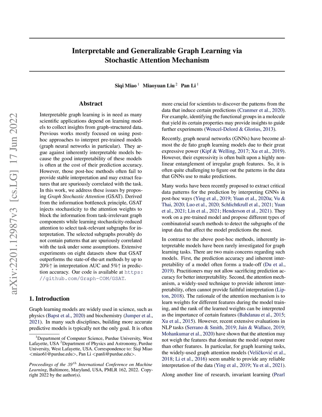 Interpretable graph learning is in need as many scientific applications depend on learning models to collect insights from graph-structured data. Previous works mostly focused on using post-hoc approaches to interpret a pre-trained model (graph neural network models in particular). They argue against inherently interpretable models because good interpretation of these models is often at the cost of their prediction accuracy. And, the widely used attention mechanism for inherent interpretation often fails to provide faithful interpretation in graph learning tasks. In this work, we address both issues by proposing Graph Stochastic Attention (GSAT), an attention mechanism derived from the information bottleneck principle. GSAT leverages stochastic attention to block the information from the task-irrelevant graph components while learning stochasticity-reduced attention to select the task-relevant subgraphs for interpretation. GSAT can also apply to fine-tuning and interpreting pre-trained models via stochastic attention mechanism. Extensive experiments on eight datasets show that GSAT outperforms the state-of-the-art methods by up to 20% in interpretation AUC and 5% in prediction accuracy.