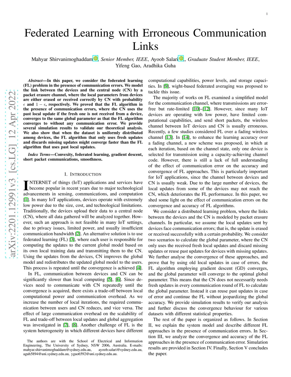 In this paper, we consider the federated learning (FL) problem in the presence of communication errors. We model the link between the devices and the central node (CN) by a packet erasure channel, where the local parameters from devices are either erased or received correctly by CN with probability and , respectively. We proved that the FL algorithm in the presence of communication errors, where the CN uses the past local update if the fresh one is not received from a device, converges to the same global parameter as that the FL algorithm converges to without any communication error. We provide several simulation results to validate our theoretical analysis. We also show that when the dataset is uniformly distributed among devices, the FL algorithm that only uses fresh updates and discards missing updates might converge faster than the FL algorithm that uses past local updates.