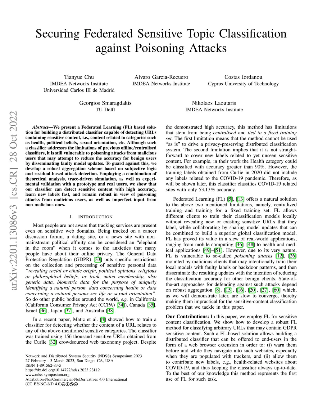 We present a Federated Learning (FL) based solution for building a distributed classifier capable of detecting URLs containing GDPR-sensitive content related to categories such as health, sexual preference, political beliefs, etc. Although such a classifier addresses the limitations of previous offline/centralised classifiers,it is still vulnerable to poisoning attacks from malicious users that may attempt to reduce the accuracy for benign users by disseminating faulty model updates. To guard against this, we develop a robust aggregation scheme based on subjective logic and residual-based attack detection. Employing a combination of theoretical analysis, trace-driven simulation, as well as experimental validation with a prototype and real users, we show that our classifier can detect sensitive content with high accuracy, learn new labels fast, and remain robust in view of poisoning attacks from malicious users, as well as imperfect input from non-malicious ones.