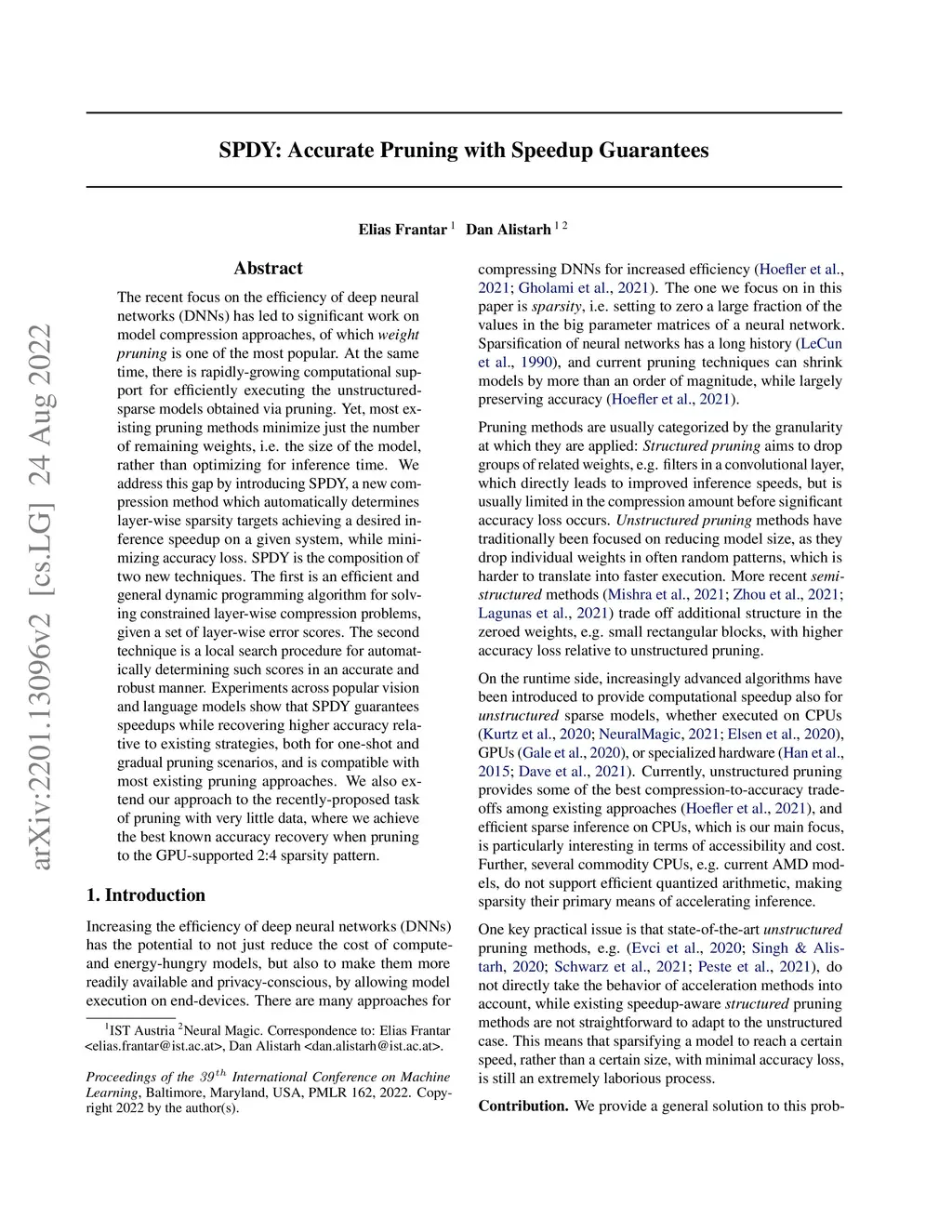 The recent focus on the efficiency of deep neural networks (DNNs) has led to significant work on model compression approaches, of which weight pruning is one of the most popular. At the same time, there is rapidly-growing computational support for efficiently executing the unstructured-sparse models obtained via pruning. Yet, most existing pruning methods minimize just the number of remaining weights, i.e. the size of the model, rather than optimizing for inference time. We address this gap by introducing SPDY, a new compression method which automatically determines layer-wise sparsity targets achieving a desired inference speedup on a given system, while minimizing accuracy loss. SPDY is composed of two new techniques: the first is an efficient dynamic programming algorithm for solving the speedup-constrained layer-wise compression problem assuming a set of given layer-wise sensitivity scores; the second is a local search procedure for determining accurate layer-wise sensitivity scores. Experiments across popular vision and language models show that SPDY guarantees speedups while recovering higher accuracy relative to existing strategies, both for one-shot and gradual pruning scenarios, and is compatible with most existing pruning approaches. We also extend our approach to the recently-proposed task of pruning with very little data, where we achieve the best known accuracy recovery when pruning to the GPU-supported 2:4 sparsity pattern.