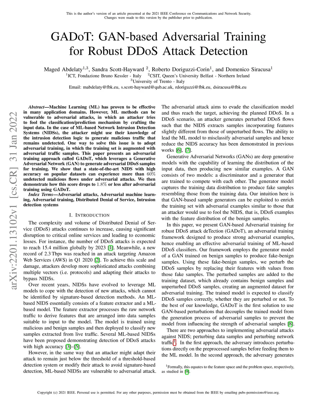 Machine Learning (ML) has proven to be effective in many application domains. However, ML methods can be vulnerable to adversarial attacks, in which an attacker tries to fool the classification/prediction mechanism by crafting the input data. In the case of ML-based Network Intrusion Detection Systems (NIDSs), the attacker might use their knowledge of the intrusion detection logic to generate malicious traffic that remains undetected. One way to solve this issue is to adopt adversarial training, in which the training set is augmented with adversarial traffic samples. This paper presents an adversarial training approach called GADoT, which leverages a Generative Adversarial Network (GAN) to generate adversarial DDoS samples for training. We show that a state-of-the-art NIDS with high accuracy on popular datasets can experience more than 60% undetected malicious flows under adversarial attacks. We then demonstrate how this score drops to 1.8% or less after adversarial training using GADoT.