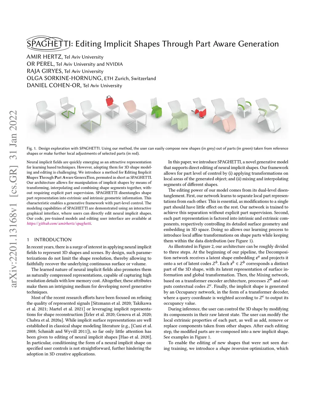 Neural implicit fields are quickly emerging as an attractive representation for learning based techniques. However, adopting them for 3D shape modeling and editing is challenging. We introduce a method for diting mplicit hapes hrough art ware eneraion, permuted in short as SPAGHETTI. Our architecture allows for manipulation of implicit shapes by means of transforming, interpolating and combining shape segments together, without requiring explicit part supervision. SPAGHETTI disentangles shape part representation into extrinsic and intrinsic geometric information. This characteristic enables a generative framework with part-level control. The modeling capabilities of SPAGHETTI are demonstrated using an interactive graphical interface, where users can directly edit neural implicit shapes.