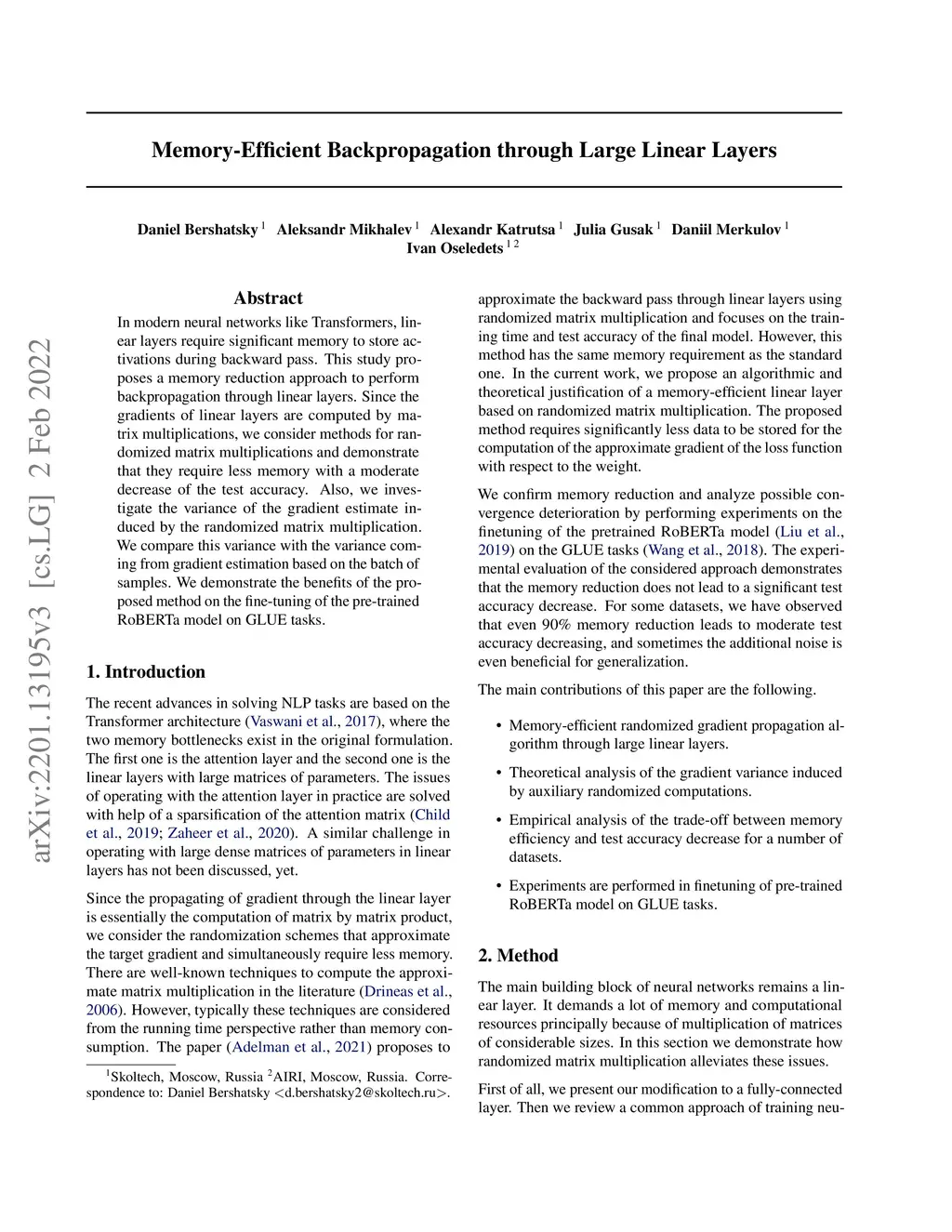In modern neural networks like Transformers, linear layers require significant memory to store activations during backward pass. This study proposes a memory reduction approach to perform backpropagation through linear layers. Since the gradients of linear layers are computed by matrix multiplications, we consider methods for randomized matrix multiplications and demonstrate that they require less memory with a moderate decrease of the test accuracy. Also, we investigate the variance of the gradient estimate induced by the randomized matrix multiplication. We compare this variance with the variance coming from gradient estimation based on the batch of samples. We demonstrate the benefits of the proposed method on the fine-tuning of the pre-trained RoBERTa model on GLUE tasks.