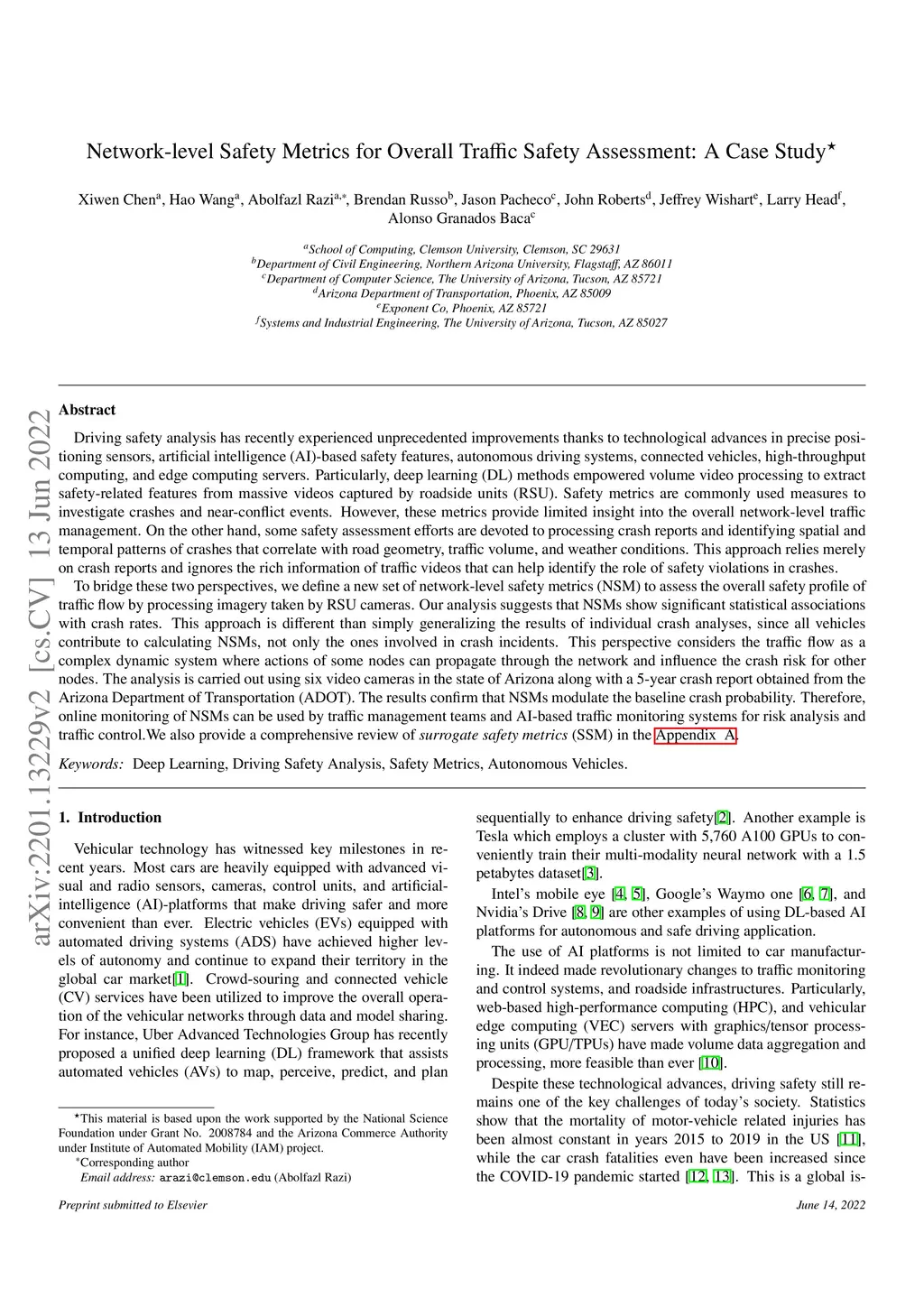 Driving safety analysis has recently experienced unprecedented improvements thanks to technological advances in precise positioning sensors, artificial intelligence (AI)-based safety features, autonomous driving systems, connected vehicles, high-throughput computing, and edge computing servers. Particularly, deep learning (DL) methods empowered volume video processing to extract safety-related features from massive videos captured by roadside units (RSU). Safety metrics are commonly used measures to investigate crashes and near-conflict events. However, these metrics provide limited insight into the overall network-level traffic management. On the other hand, some safety assessment efforts are devoted to processing crash reports and identifying spatial and temporal patterns of crashes that correlate with road geometry, traffic volume, and weather conditions. This approach relies merely on crash reports and ignores the rich information of traffic videos that can help identify the role of safety violations in crashes. To bridge these two perspectives, we define a new set of network-level safety metrics (NSM) to assess the overall safety profile of traffic flow by processing imagery taken by RSU cameras. Our analysis suggests that NSMs show significant statistical associations with crash rates. This approach is different than simply generalizing the results of individual crash analyses, since all vehicles contribute to calculating NSMs, not only the ones involved in crash incidents. This perspective considers the traffic flow as a complex dynamic system where actions of some nodes can propagate through the network and influence the crash risk for other nodes. We also provide a comprehensive review of surrogate safety metrics (SSM) in the Appendix A.