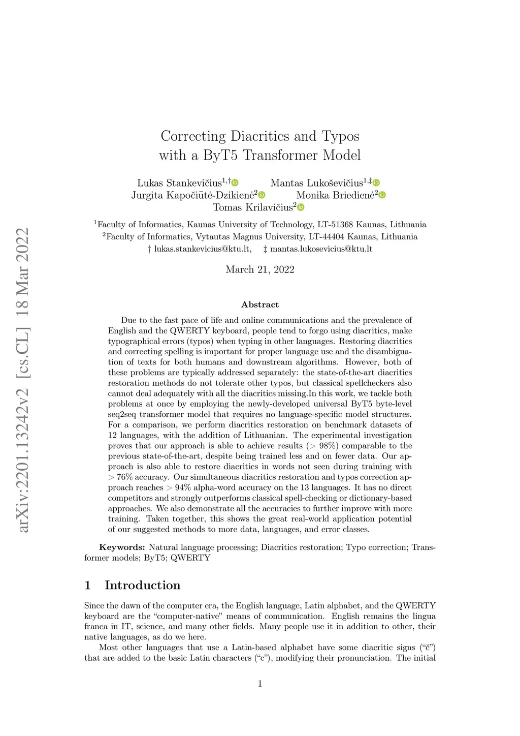 Correcting diacritics and typos with a ByT5 transformer model