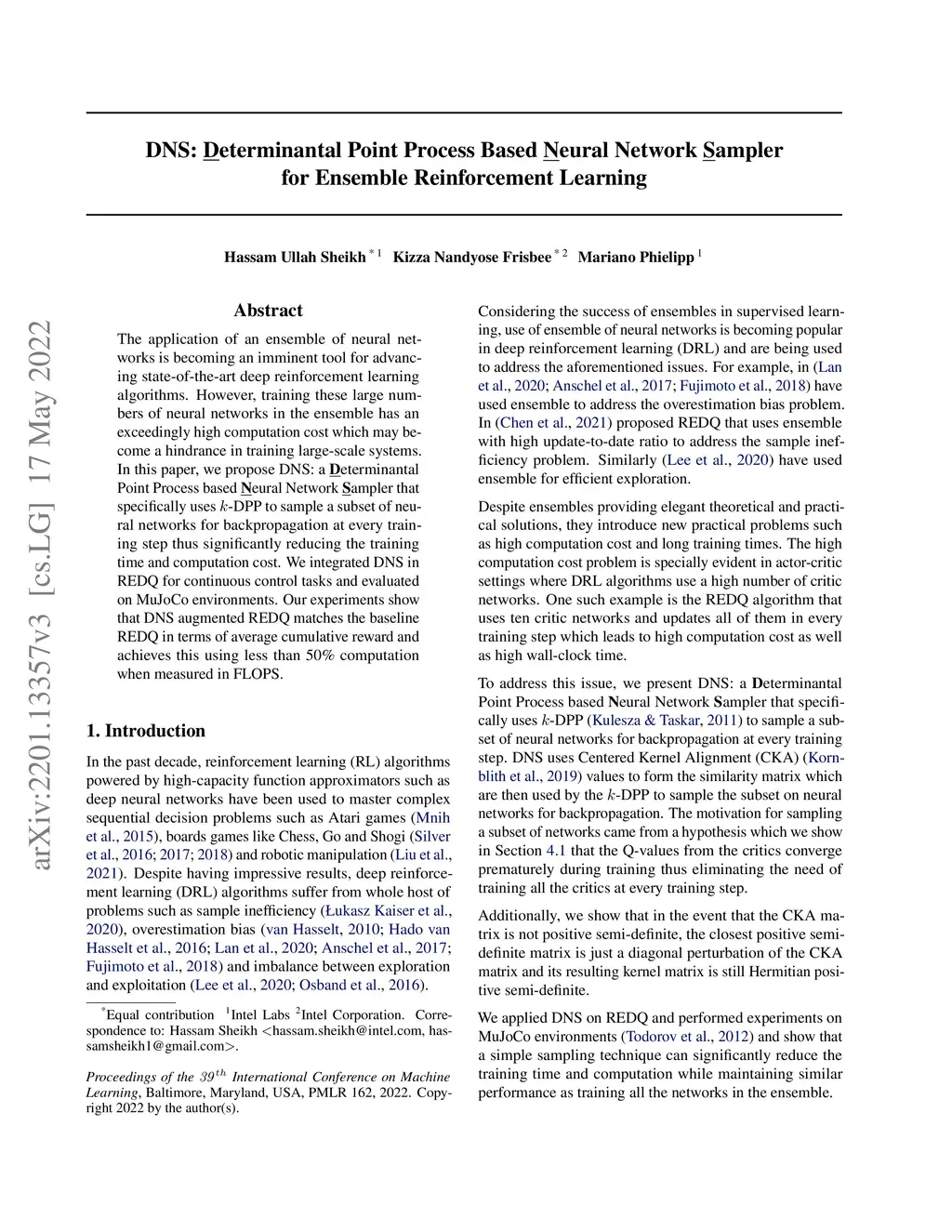 Application of ensemble of neural networks is becoming an imminent tool for advancing the state-of-the-art in deep reinforcement learning algorithms. However, training these large numbers of neural networks in the ensemble has an exceedingly high computation cost which may become a hindrance in training large-scale systems. In this paper, we propose DNS: a Determinantal Point Process based Neural Network Sampler that specifically uses k-dpp to sample a subset of neural networks for backpropagation at every training step thus significantly reducing the training time and computation cost. We integrated DNS in REDQ for continuous control tasks and evaluated on MuJoCo environments. Our experiments show that DNS augmented REDQ outperforms baseline REDQ in terms of average cumulative reward and achieves this using less than 50% computation when measured in FLOPS.
