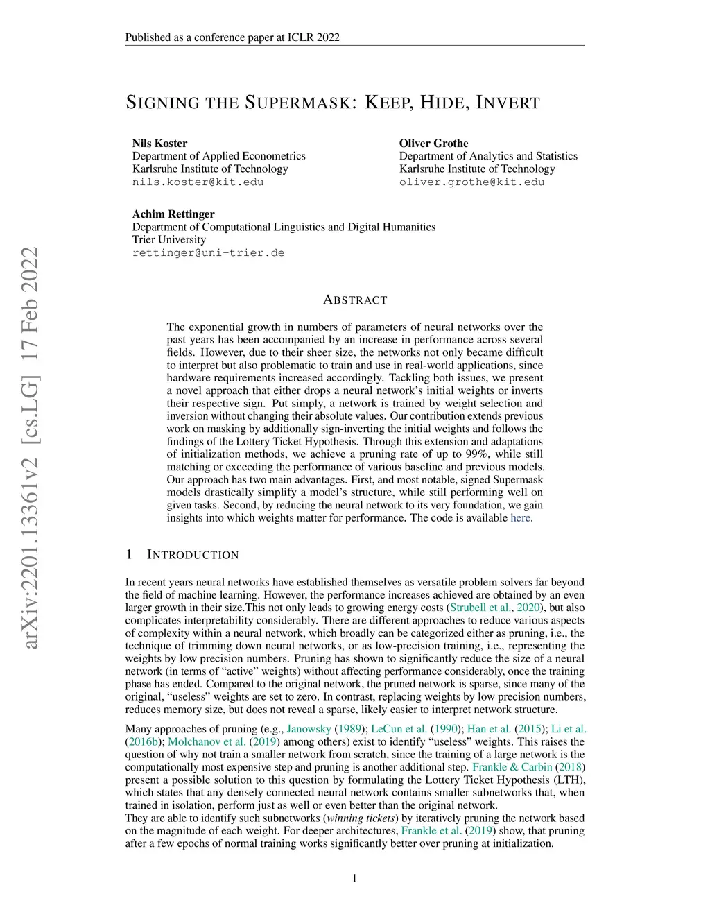 The exponential growth in numbers of parameters of neural networks over the past years has been accompanied by an increase in performance across several fields. However, due to their sheer size, the networks not only became difficult to interpret but also problematic to train and use in real-world applications, since hardware requirements increased accordingly. Tackling both issues, we present a novel approach that either drops a neural network's initial weights or inverts their respective sign. Put simply, a network is trained by weight selection and inversion without changing their absolute values. Our contribution extends previous work on masking by additionally sign-inverting the initial weights and follows the findings of the Lottery Ticket Hypothesis. Through this extension and adaptations of initialization methods, we achieve a pruning rate of up to 99%, while still matching or exceeding the performance of various baseline and previous models. Our approach has two main advantages. First, and most notable, signed Supermask models drastically simplify a model's structure, while still performing well on given tasks. Second, by reducing the neural network to its very foundation, we gain insights into which weights matter for performance. The code is available on GitHub.