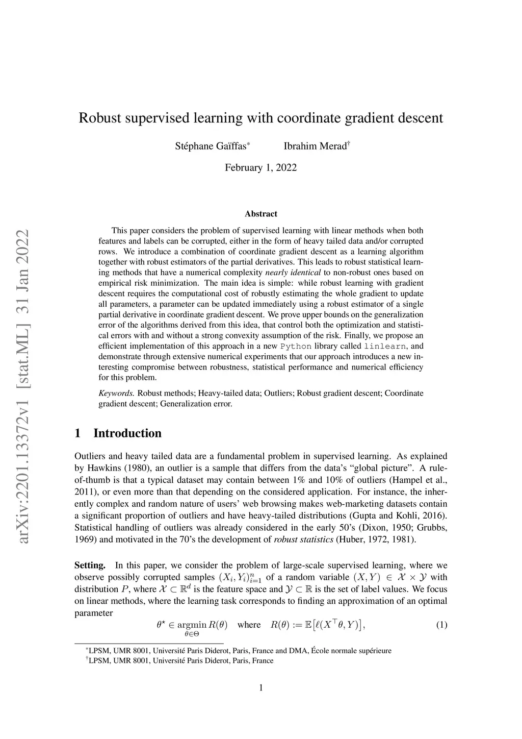 Robust supervised learning with coordinate gradient descent