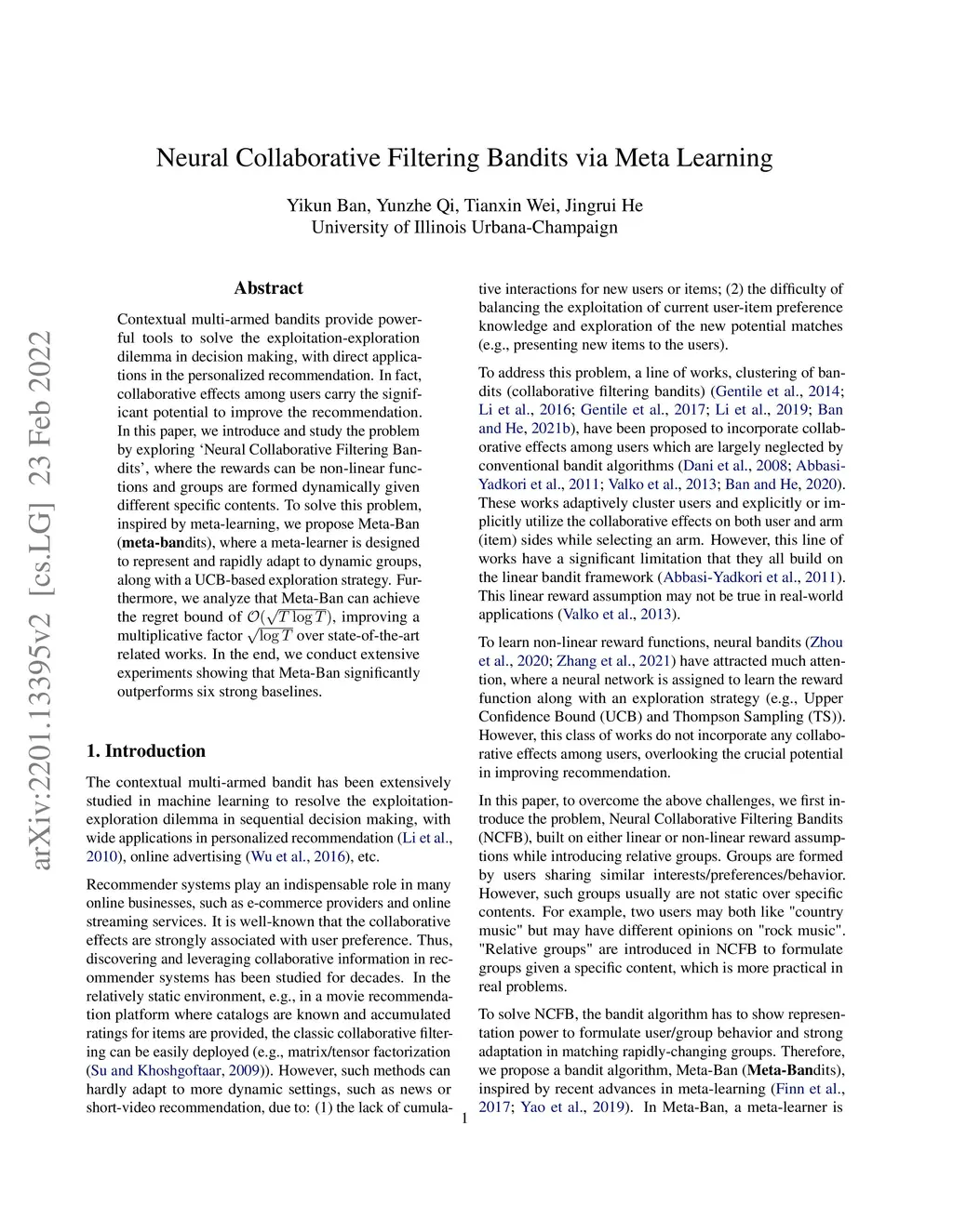 Contextual multi-armed bandits provide powerful tools to solve the exploitation-exploration dilemma in decision making, with direct applications in the personalized recommendation. In fact, collaborative effects among users carry the significant potential to improve the recommendation. In this paper, we introduce and study the problem by exploring `Neural Collaborative Filtering Bandits', where the rewards can be non-linear functions and groups are formed dynamically given different specific contents. To solve this problem, inspired by meta-learning, we propose Meta-Ban (meta-bandits), where a meta-learner is designed to represent and rapidly adapt to dynamic groups, along with a UCB-based exploration strategy. Furthermore, we analyze that Meta-Ban can achieve the regret bound of , improving a multiplicative factor over state-of-the-art related works. In the end, we conduct extensive experiments showing that Meta-Ban significantly outperforms six strong baselines.