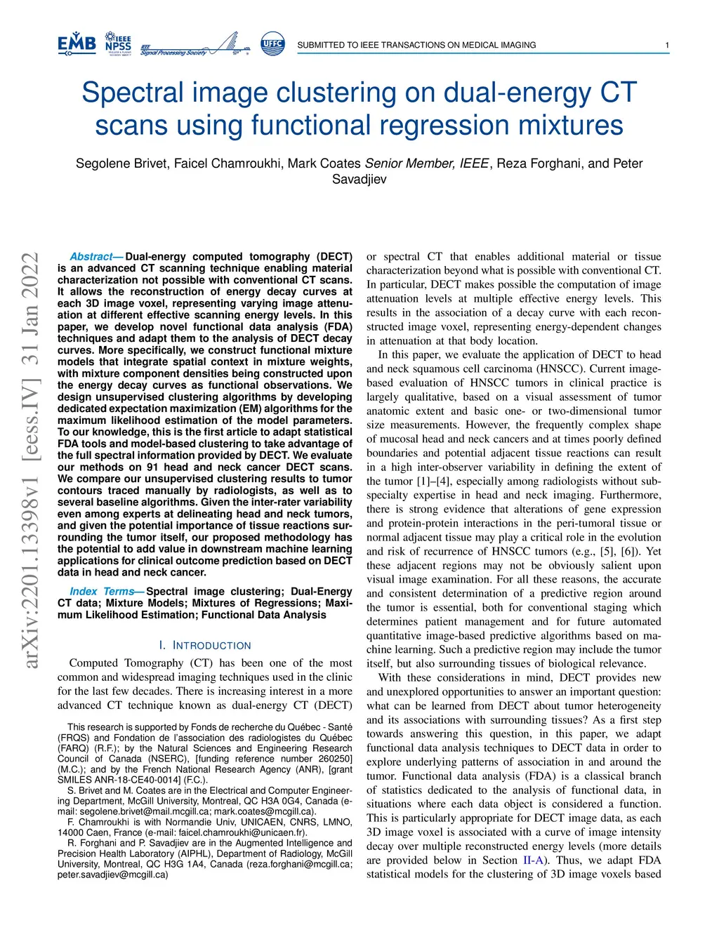 Dual-energy computed tomography (DECT) is an advanced CT scanning technique enabling material characterization not possible with conventional CT scans. It allows the reconstruction of energy decay curves at each 3D image voxel, representing varying image attenuation at different effective scanning energy levels. In this paper, we develop novel functional data analysis (FDA) techniques and adapt them to the analysis of DECT decay curves. More specifically, we construct functional mixture models that integrate spatial context in mixture weights, with mixture component densities being constructed upon the energy decay curves as functional observations. We design unsupervised clustering algorithms by developing dedicated expectation maximization (EM) algorithms for the maximum likelihood estimation of the model parameters. To our knowledge, this is the first article to adapt statistical FDA tools and model-based clustering to take advantage of the full spectral information provided by DECT. We evaluate our methods on 91 head and neck cancer DECT scans. We compare our unsupervised clustering results to tumor contours traced manually by radiologists, as well as to several baseline algorithms. Given the inter-rater variability even among experts at delineating head and neck tumors, and given the potential importance of tissue reactions surrounding the tumor itself, our proposed methodology has the potential to add value in downstream machine learning applications for clinical outcome prediction based on DECT data in head and neck cancer.