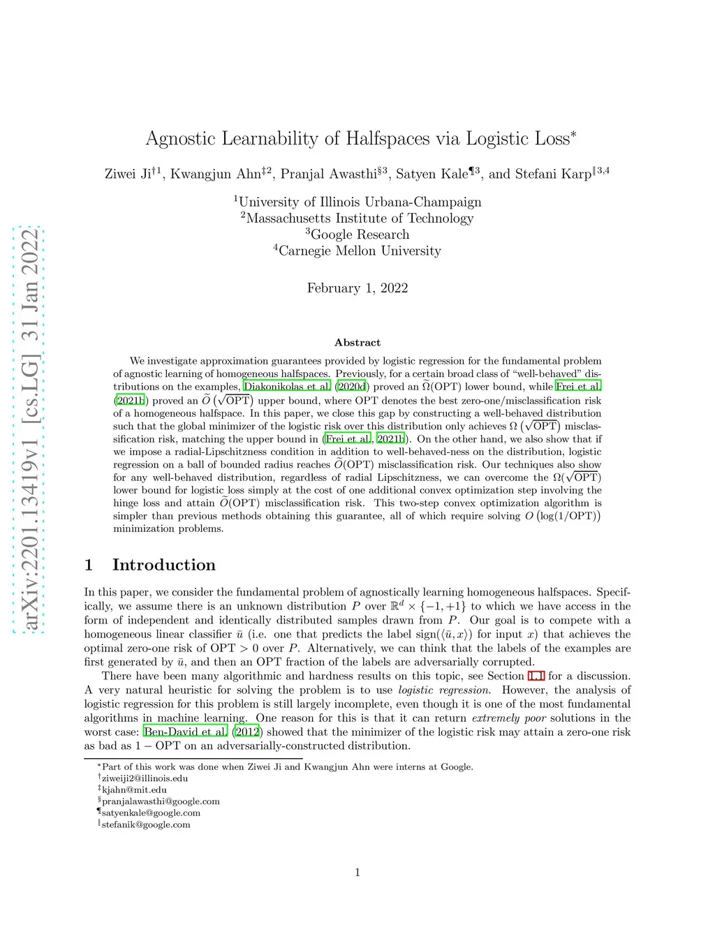 Agnostic Learnability of Halfspaces via Logistic Loss