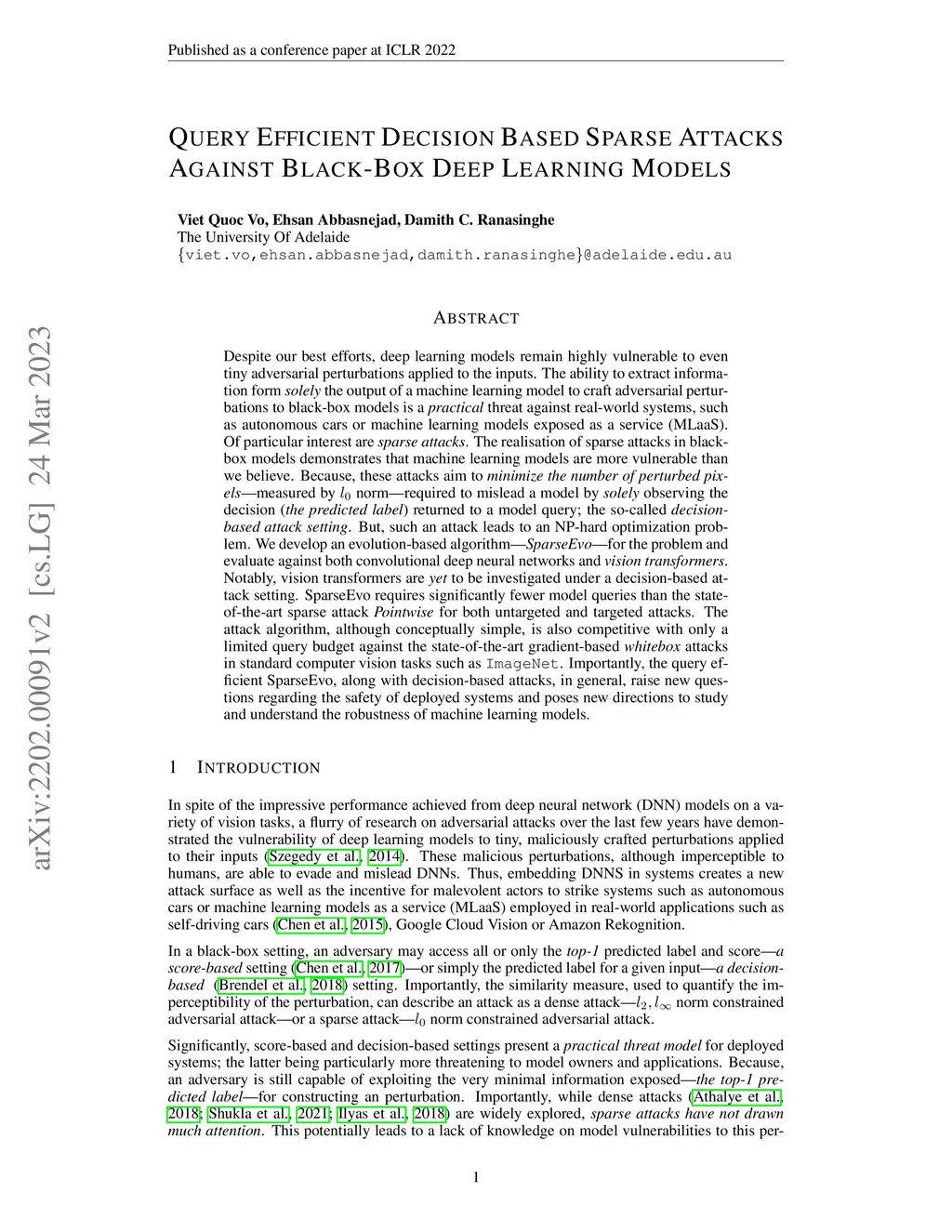 Despite our best efforts, deep learning models remain highly vulnerable to even tiny adversarial perturbations applied to the inputs. The ability to extract information from solely the output of a machine learning model to craft adversarial perturbations to black-box models is a practical threat against real-world systems, such as autonomous cars or machine learning models exposed as a service (MLaaS). Of particular interest are sparse attacks. The realization of sparse attacks in black-box models demonstrates that machine learning models are more vulnerable than we believe. Because these attacks aim to minimize the number of perturbed pixels measured by l_0 norm-required to mislead a model by solely observing the decision (the predicted label) returned to a model query; the so-called decision-based attack setting. But, such an attack leads to an NP-hard optimization problem. We develop an evolution-based algorithm-SparseEvo-for the problem and evaluate against both convolutional deep neural networks and vision transformers. Notably, vision transformers are yet to be investigated under a decision-based attack setting. SparseEvo requires significantly fewer model queries than the state-of-the-art sparse attack Pointwise for both untargeted and targeted attacks. The attack algorithm, although conceptually simple, is also competitive with only a limited query budget against the state-of-the-art gradient-based whitebox attacks in standard computer vision tasks such as ImageNet. Importantly, the query efficient SparseEvo, along with decision-based attacks, in general, raise new questions regarding the safety of deployed systems and poses new directions to study and understand the robustness of machine learning models.