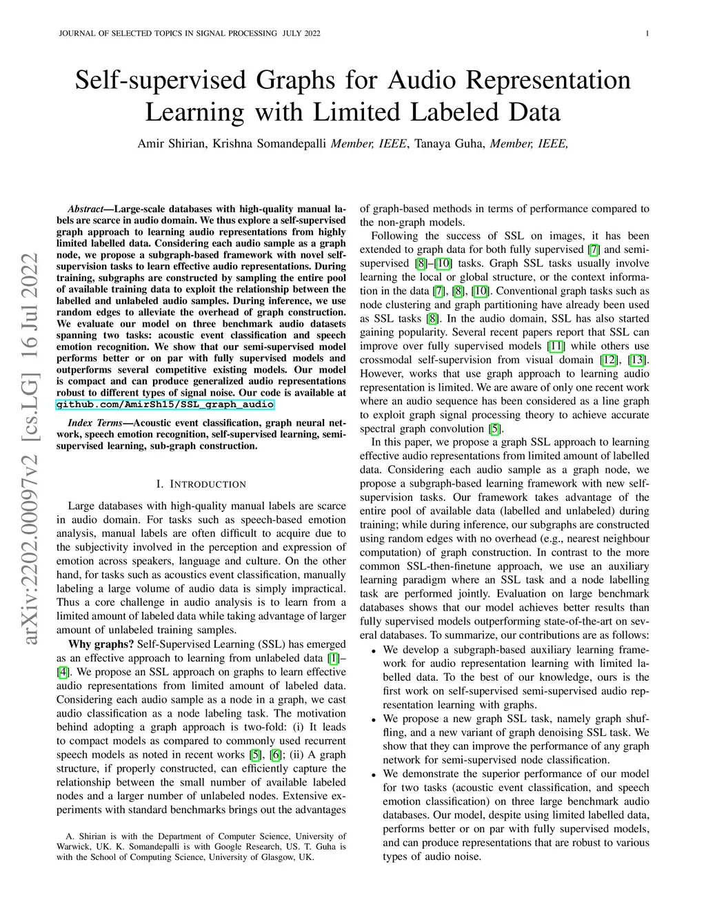 Large scale databases with high-quality manual annotations are scarce in audio domain. We thus explore a self-supervised graph approach to learning audio representations from highly limited labelled data. Considering each audio sample as a graph node, we propose a subgraph-based framework with novel self-supervision tasks that can learn effective audio representations. During training, subgraphs are constructed by sampling the entire pool of available training data to exploit the relationship between the labelled and unlabeled audio samples. During inference, we use random edges to alleviate the overhead of graph construction. We evaluate our model on three benchmark audio databases, and two tasks: acoustic event detection and speech emotion recognition. Our semi-supervised model performs better or on par with fully supervised models and outperforms several competitive existing models. Our model is compact (240k parameters), and can produce generalized audio representations that are robust to different types of signal noise.