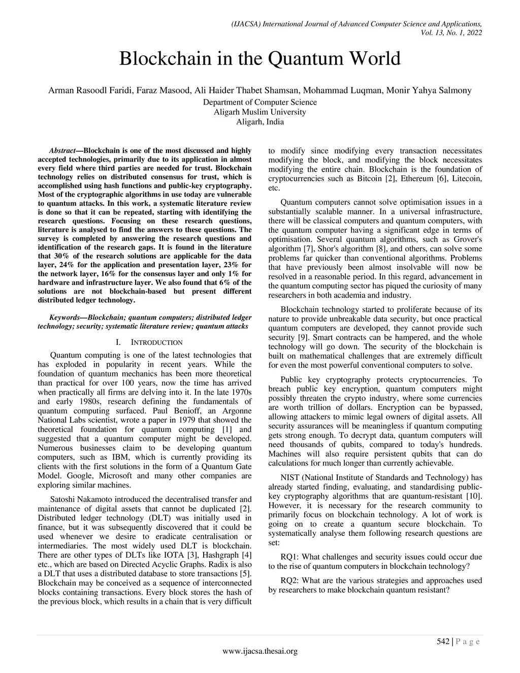 Blockchain is one of the most discussed and highly accepted technologies, primarily due to its application in almost every field where third parties are needed for trust. Blockchain technology relies on distributed consensus for trust, which is accomplished using hash functions and public-key cryptography. Most of the cryptographic algorithms in use today are vulnerable to quantum attacks. In this work, a systematic literature review is done so that it can be repeated, starting with identifying the research questions. Focusing on these research questions, literature is analysed to find the answers to these questions. The survey is completed by answering the research questions and identification of the research gaps. It is found in the literature that 30% of the research solutions are applicable for the data layer, 24% for the application and presentation layer, 23% for the network layer, 16% for the consensus layer and only 1% for hardware and infrastructure layer. We also found that 6% of the solutions are not blockchain-based but present different distributed ledger technology.