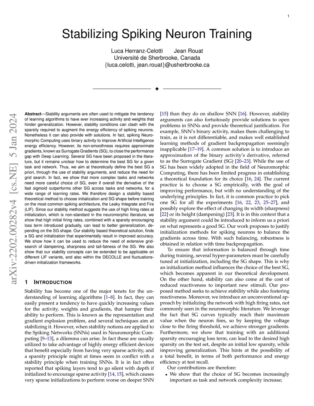 Stability arguments are often used to prevent learning algorithms from having ever increasing activity and weights that hinder generalization. However, stability conditions can clash with the sparsity required to augment the energy efficiency of spiking neurons. Nonetheless it can also provide solutions. In fact, spiking Neuromorphic Computing uses binary activity to improve Artificial Intelligence energy efficiency. However, its non-smoothness requires approximate gradients, known as Surrogate Gradients (SG), to close the performance gap with Deep Learning. Several SG have been proposed in the literature, but it remains unclear how to determine the best SG for a given task and network. Thus, we aim at theoretically define the best SG, through stability arguments, to reduce the need for grid search. In fact, we show that more complex tasks and networks need more careful choice of SG, even if overall the derivative of the fast sigmoid tends to outperform the other, for a wide range of learning rates. We therefore design a stability based theoretical method to choose initialization and SG shape before training on the most common spiking neuron, the Leaky Integrate and Fire (LIF). Since our stability method suggests the use of high firing rates at initialization, which is non-standard in the neuromorphic literature, we show that high initial firing rates, combined with a sparsity encouraging loss term introduced gradually, can lead to better generalization, depending on the SG shape. Our stability based theoretical solution, finds a SG and initialization that experimentally result in improved accuracy. We show how it can be used to reduce the need of extensive grid-search of dampening, sharpness and tail-fatness of the SG. We also show that our stability concepts can be extended to be applicable on different LIF variants, such as DECOLLE and fluctuations-driven initializations.