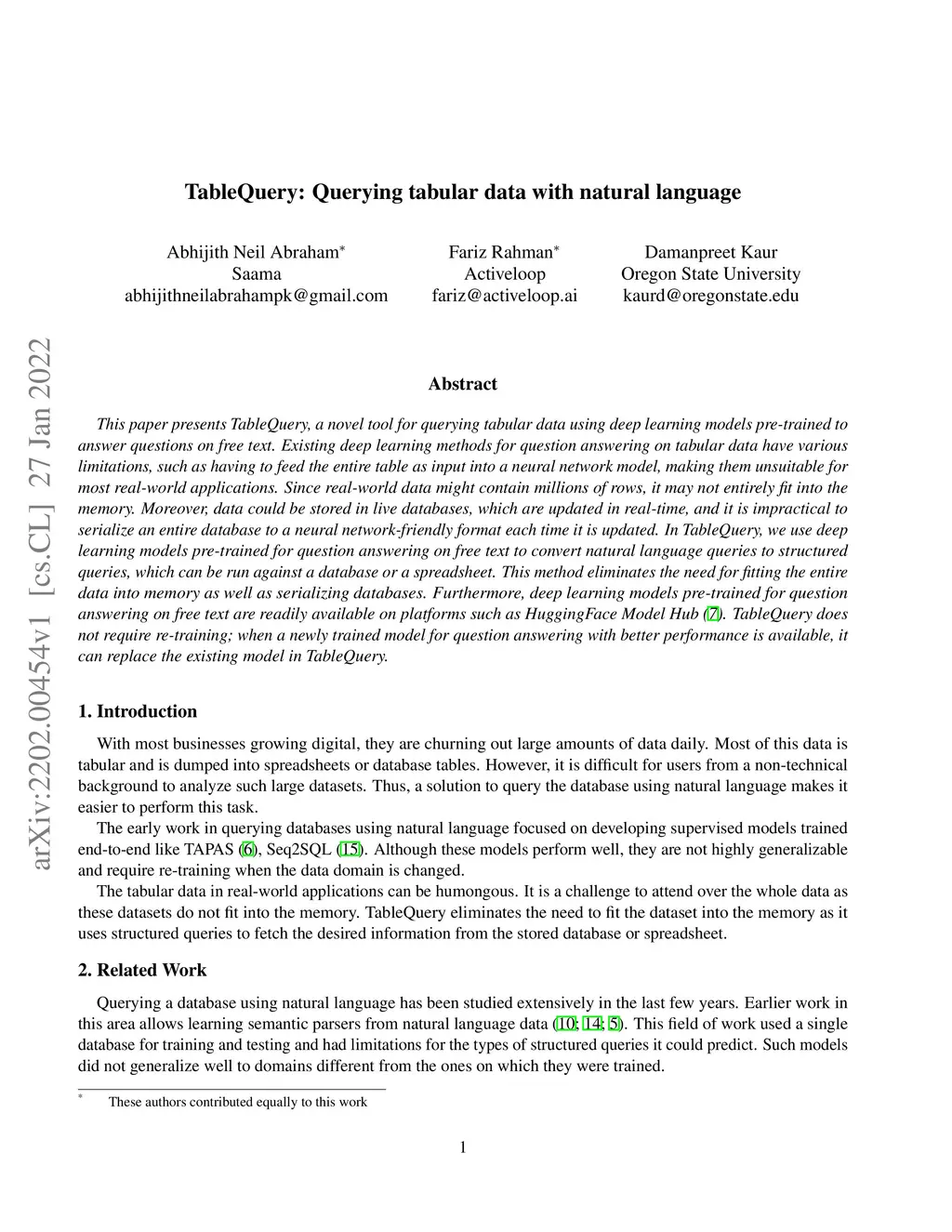 This paper presents TableQuery, a novel tool for querying tabular data using deep learning models pre-trained to answer questions on free text. Existing deep learning methods for question answering on tabular data have various limitations, such as having to feed the entire table as input into a neural network model, making them unsuitable for most real-world applications. Since real-world data might contain millions of rows, it may not entirely fit into the memory. Moreover, data could be stored in live databases, which are updated in real-time, and it is impractical to serialize an entire database to a neural network-friendly format each time it is updated. In TableQuery, we use deep learning models pre-trained for question answering on free text to convert natural language queries to structured queries, which can be run against a database or a spreadsheet. This method eliminates the need for fitting the entire data into memory as well as serializing databases. Furthermore, deep learning models pre-trained for question answering on free text are readily available on platforms such as HuggingFace Model Hub (7). TableQuery does not require re-training; when a newly trained model for question answering with better performance is available, it can replace the existing model in TableQuery.