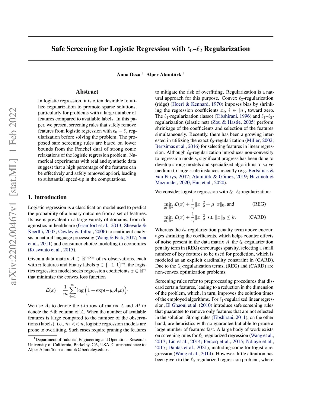 In logistic regression, it is often desirable to utilize regularization to promote sparse solutions, particularly for problems with a large number of features compared to available labels. In this paper, we present screening rules that safely remove features from logistic regression with regularization before solving the problem. The proposed safe screening rules are based on lower bounds from the Fenchel dual of strong conic relaxations of the logistic regression problem. Numerical experiments with real and synthetic data suggest that a high percentage of the features can be effectively and safely removed apriori, leading to substantial speed-up in the computations.