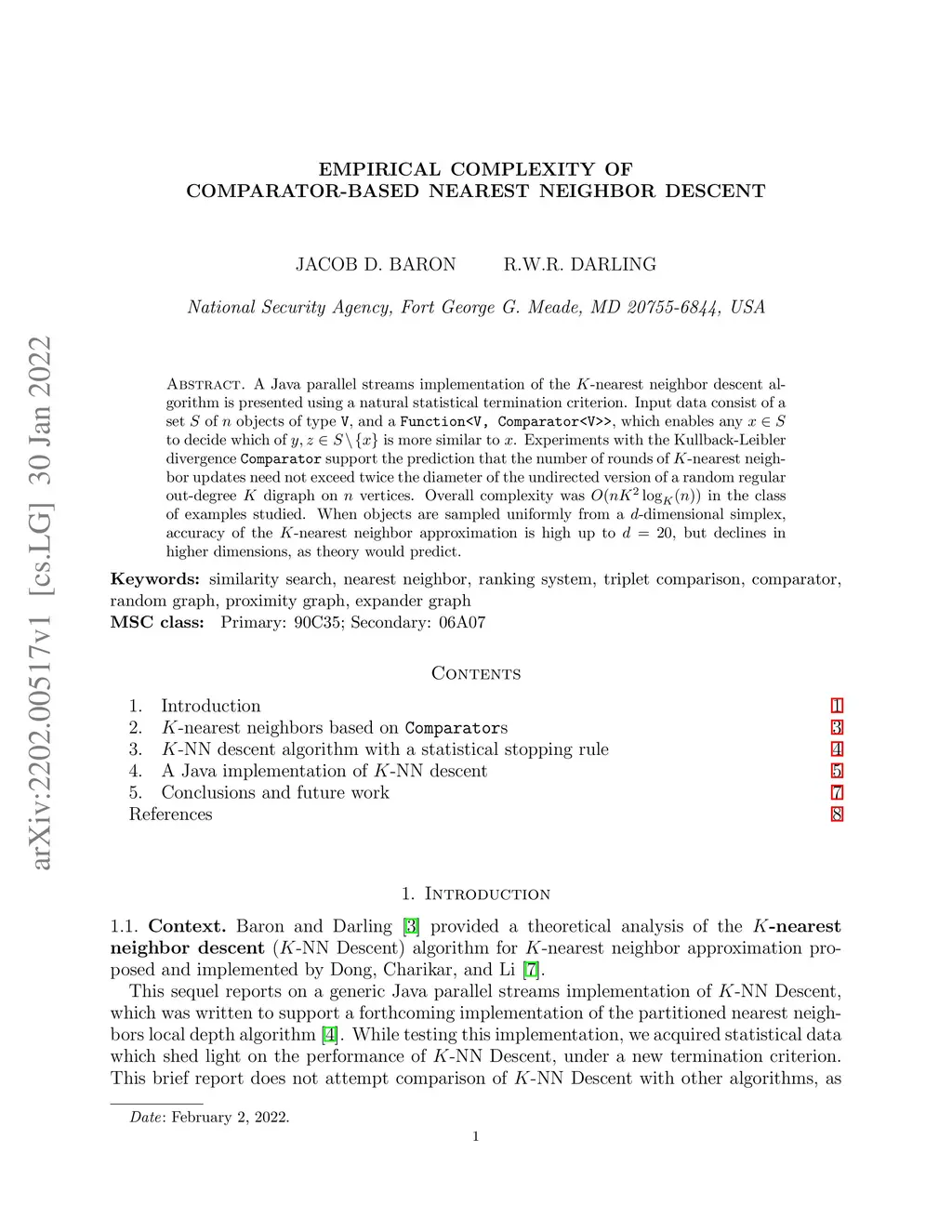 A Java parallel streams implementation of the -nearest neighbor descent algorithm is presented using a natural statistical termination criterion. Input data consist of a set of objects of type V, and a Function<V, Comparator<V>>, which enables any to decide which of is more similar to . Experiments with the Kullback-Leibler divergence Comparator support the prediction that the number of rounds of -nearest neighbor updates need not exceed twice the diameter of the undirected version of a random regular out-degree digraph on vertices. Overall complexity was in the class of examples studied. When objects are sampled uniformly from a -dimensional simplex, accuracy of the -nearest neighbor approximation is high up to , but declines in higher dimensions, as theory would predict.